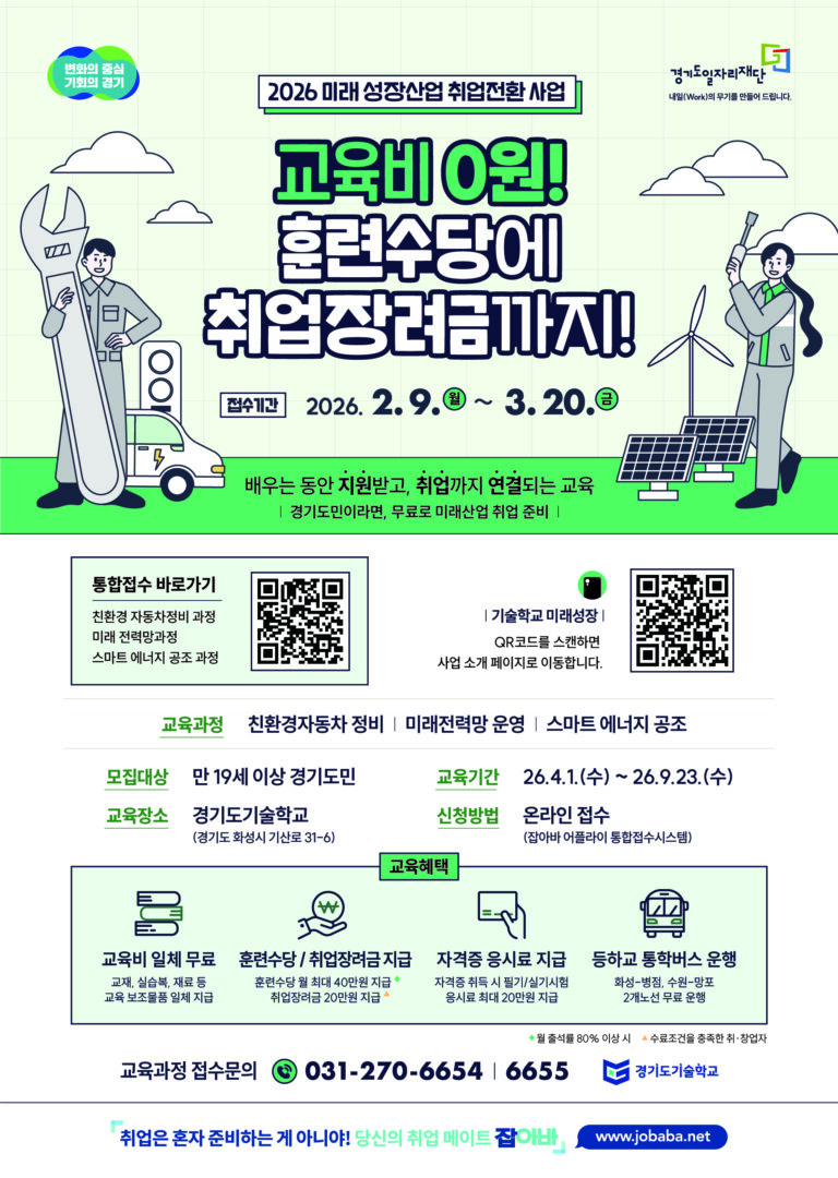 외부공지 2026년 ‘미래 성장산업 취업전환 사업’ 무료 취업교육생 모집공고 2026.02.11 조회수 213 취업지원팀 share facebook twitter kakaotalk 카카오톡 앱이설치된 모바일 기기에서만공유 가능합니다. https://www.syu.ac.kr/nbr5 share 복사 본문2026년-미래-성장산업-취업전환-사업-무료-취업교육생-모집공고-홍보요청.pdf (143.0 KB) facebook twitter kakaotalk 카카오톡 앱이설치된 모바일 기기에서만공유 가능합니다. 이전글 2026년도 지역 장애아동지원센터 기간제 계약직 채용 다음글 관악드림온 아카데미 홍보 목록