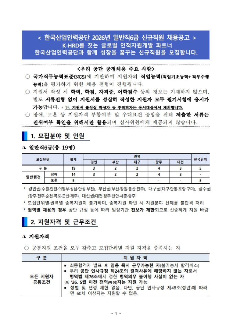 외부공지 한국산업인력공단 2026년 상반기 일반직6급 신규직원 채용공고 2026.02.03 조회수 228 취업지원팀 share facebook twitter kakaotalk 카카오톡 앱이설치된 모바일 기기에서만공유 가능합니다. https://www.syu.ac.kr/gpbh share 복사 2026년-상반기-일반직6급-신규직원-채용공고.pdf (419.4 KB) facebook twitter kakaotalk 카카오톡 앱이설치된 모바일 기기에서만공유 가능합니다. 이전글 글이 없습니다. 다음글 2026년 중앙전파관리소 청년인턴 1차채용 목록