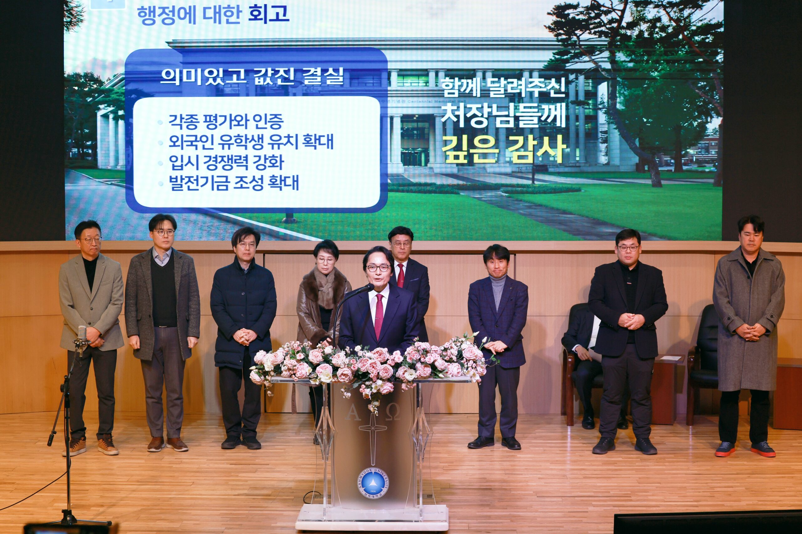 제 총장은 “지난 2년은 각종 평가와 인증, 외국인 유학생 유치 확대, 입시 경쟁력 강화, 발전기금 확충 등 여러 영역에서 의미 있는 성과를 함께 만들어 온 시간이었다”며 “행정의 안정과 성과라는 두 과제를 위해 헌신해 준 처장단과 각 부서 구성원들에게 깊이 감사드린다”고 말했다.