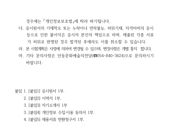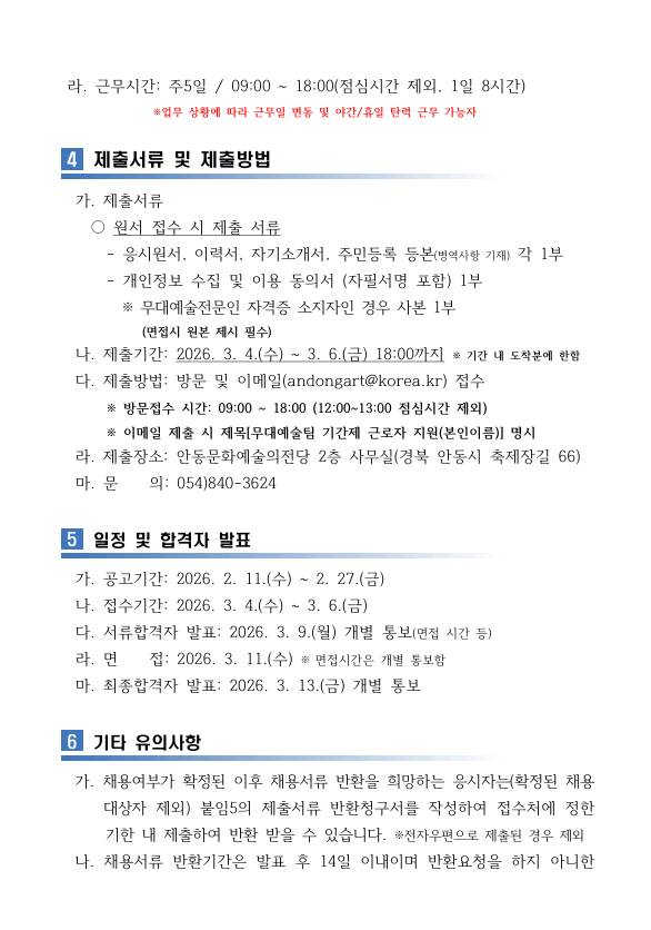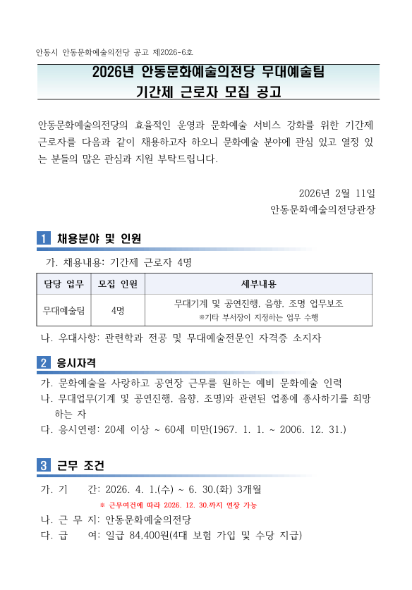 외부공지 2026년 안동문화예술의전당 무대예술팀 기간제 근로자 모집 공고 2026.02.12 조회수 963 취업지원팀 share facebook twitter kakaotalk 카카오톡 앱이설치된 모바일 기기에서만공유 가능합니다. https://www.syu.ac.kr/ltnn share 복사 2026년-기간제근로자-모집-공고문.pdf (84.8 KB) 무대예술팀기간제근로자-응시원서-및-제출서류.hwp (57.5 KB) facebook twitter kakaotalk 카카오톡 앱이설치된 모바일 기기에서만공유 가능합니다. 이전글 글이 없습니다. 다음글 2026년 경기청년 해외진출(유럽) 사업 참여자 모집 목록