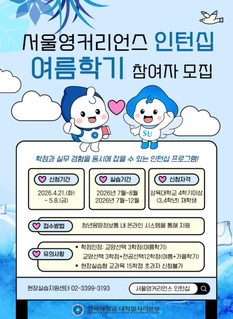 서울영커리언스-인턴십-참여자-모집-002 서울영커리언스-인턴십-참여자-모집-002 2026.04.22 조회수 0 취업지원팀 share facebook twitter kakaotalk 카카오톡 앱이설치된 모바일 기기에서만공유 가능합니다. https://www.syu.ac.kr/?p=244276 share 복사 facebook twitter kakaotalk 카카오톡 앱이설치된 모바일 기기에서만공유 가능합니다. 이전글 글이 없습니다. 다음글 글이 없습니다. 목록