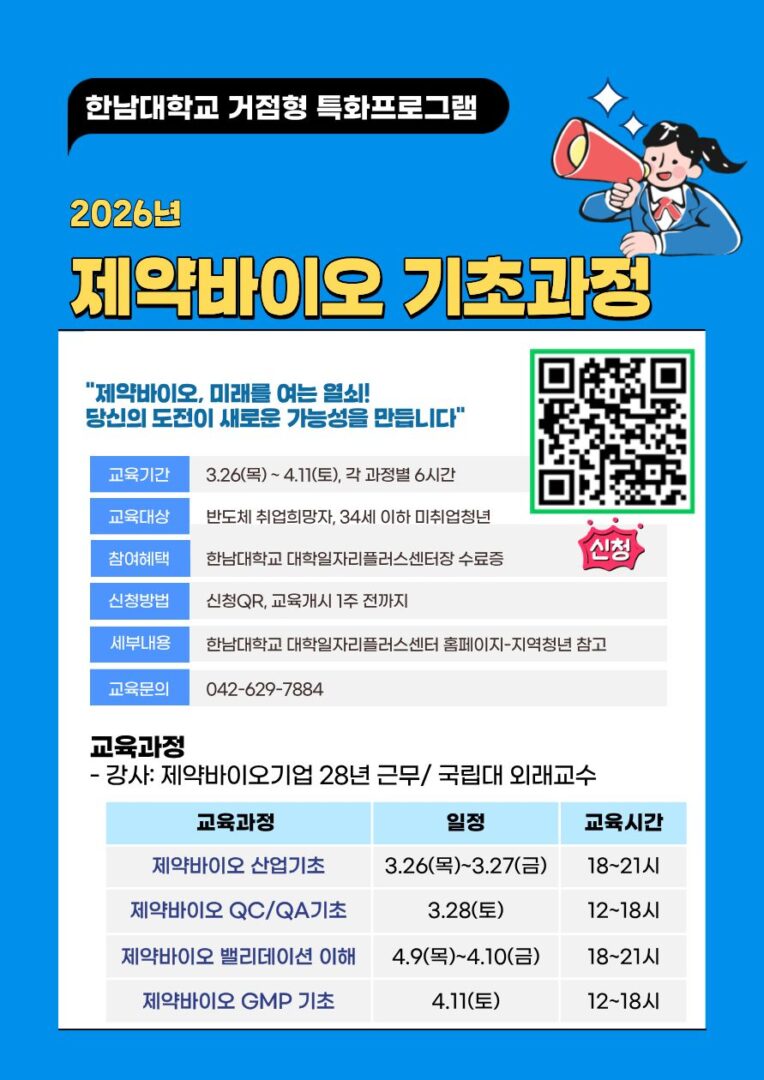 외부공지 2026년 제약바이오 기초과정 2026.03.12 조회수 408 취업지원팀 share facebook twitter kakaotalk 카카오톡 앱이설치된 모바일 기기에서만공유 가능합니다. https://www.syu.ac.kr/1sls share 복사 facebook twitter kakaotalk 카카오톡 앱이설치된 모바일 기기에서만공유 가능합니다. 이전글 2026 스포츠산업 채용박람회 다음글 [KOSA] 3,4월 채용연계형 교육생 모집 목록