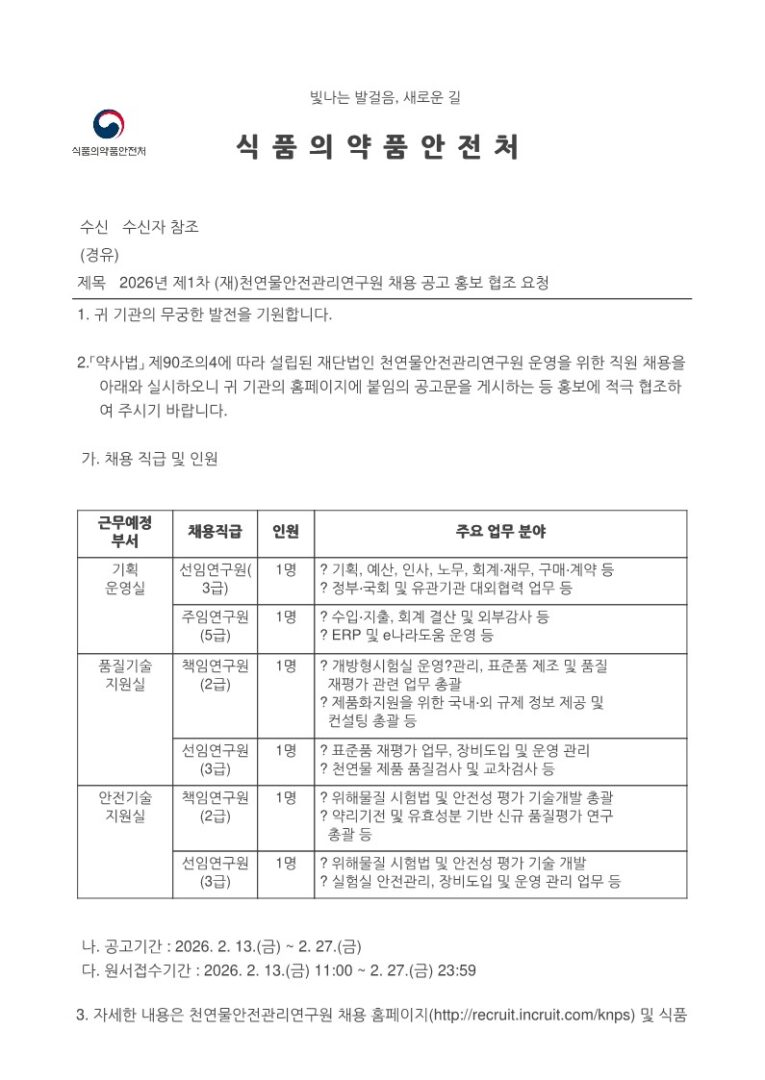 외부공지 2026년 제1차 (재)천연물안전관리연구원 채용 공고 2026.02.19 조회수 58 취업지원팀 share facebook twitter kakaotalk 카카오톡 앱이설치된 모바일 기기에서만공유 가능합니다. https://www.syu.ac.kr/ec29 share 복사 본문-2026년-제1차-재천연물안전관리연구원-채용-공고-홍보-협조-요청.pdf (260.9 KB) 2026년-제1차-재천연물안전관리연구원-직원-채용-공고문.pdf (820.7 KB) 삼육대학교-2026-01938.pdf (99.0 KB) facebook twitter kakaotalk 카카오톡 앱이설치된 모바일 기기에서만공유 가능합니다. 이전글 글이 없습니다. 다음글 보건복지부 청년 인턴 채용 공고 목록