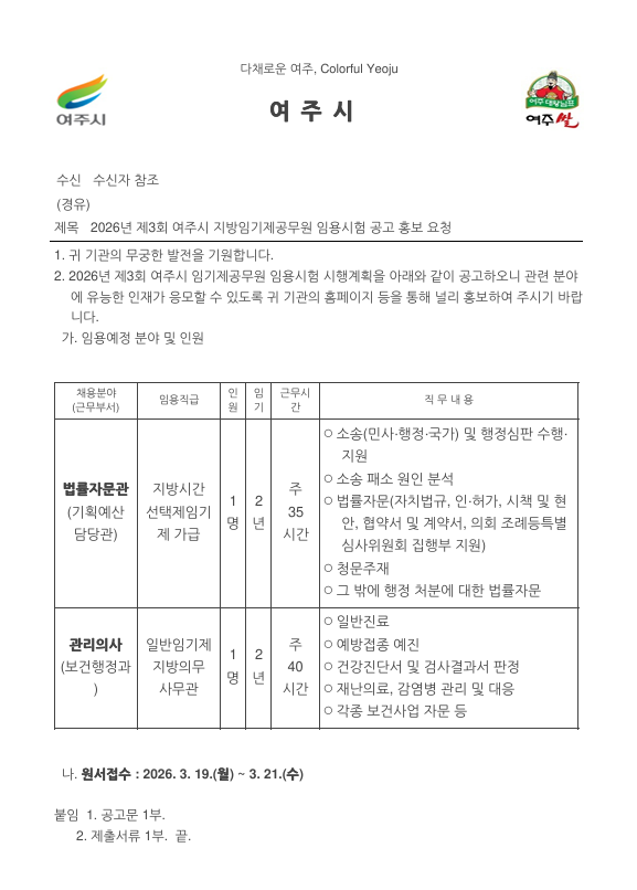 외부공지 2026년 제3회 여주시 지방임기제공무원 임용시험 공고 홍보 요 2026.02.24 조회수 2,191 취업지원팀 share facebook twitter kakaotalk 카카오톡 앱이설치된 모바일 기기에서만공유 가능합니다. https://www.syu.ac.kr/wxda share 복사 01-2-제3회-임용시험-공고문_배포용.hwp (98.0 KB) 01-3-제3회-임용시험-제출서류.hwp (85.0 KB) facebook twitter kakaotalk 카카오톡 앱이설치된 모바일 기기에서만공유 가능합니다. 이전글 2026년 바이오헬스산업 일자리 아카데미 안내 다음글 [합천군] 2026년 농기계 업무보조원 기간제근로자 채용 공고 목록