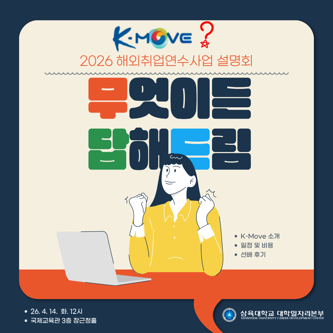 삼육대학교는 고용노동부와 한국산업인력공단에서 주관하는 2026년 해외취업연수사업(K-Move School) 신청해진대학에 신규 선정되어 다음과 같이 연수생을 모집하오니 해외취업에 관심 있는 학생들의 많은 참여 바랍니다.