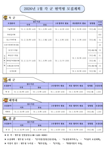 생활공지 2026년 1월 각 군 현역병 모집계획 2026.01.19 조회수 28 예비군대대 share facebook twitter kakaotalk 카카오톡 앱이설치된 모바일 기기에서만공유 가능합니다. https://www.syu.ac.kr/vb2b share 복사 26년-1월-각-군-현역병-모집계획배부용.hwpx (1.3 MB) facebook twitter kakaotalk 카카오톡 앱이설치된 모바일 기기에서만공유 가능합니다. 이전글 글이 없습니다. 다음글 모집2026년 경기푸른미래관 입사생 선발 지원자 모집 안내 목록