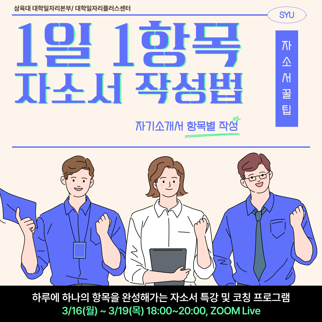[1일 1항목 자소서 작성법]3/16(월)-3/19(목) 18:00-20:30 에, 온라인 ZOOM Live 로 운영됩니다. 관심 있는 학생들의 많은 참여 바랍니다 🙂