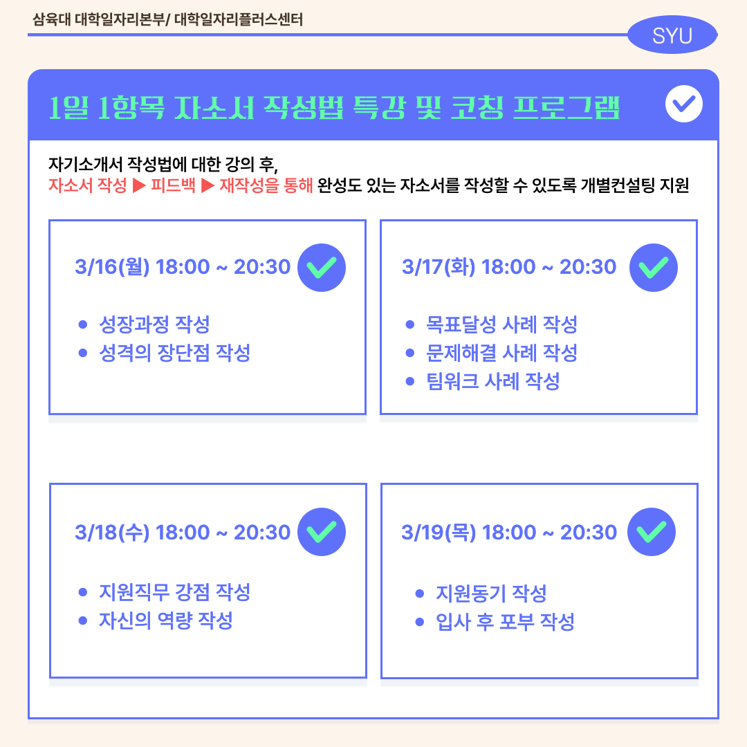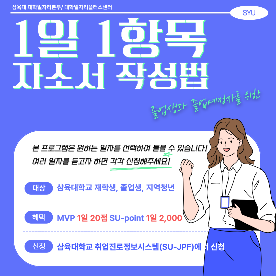 삼육대학교 대학일자리본부에서는 하루에 하나의 자소서 항목을 완성해가는 특강 및 코칭 프로그램 [1일 1항목 자소서 작성법] 특강을 운영합니다.