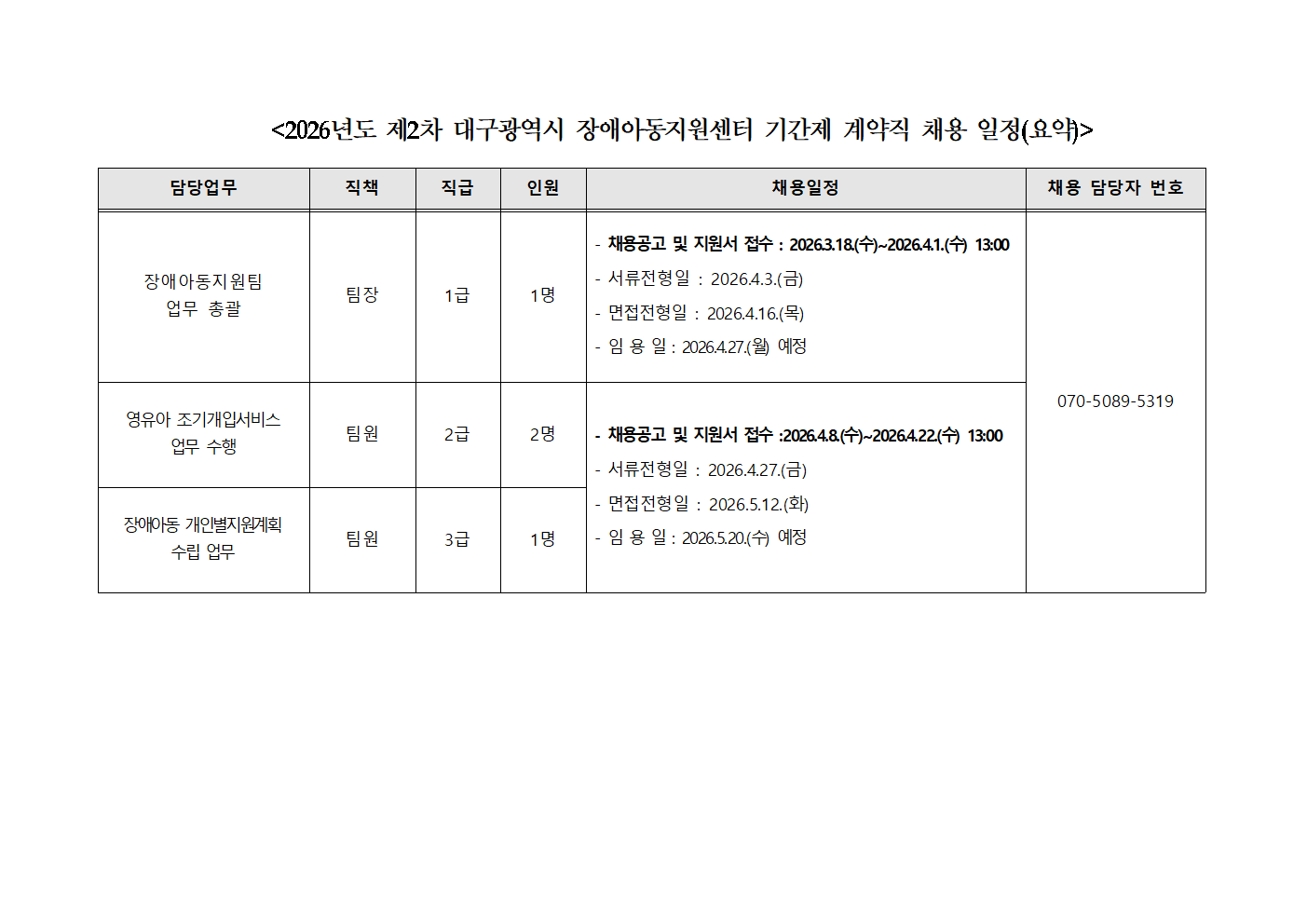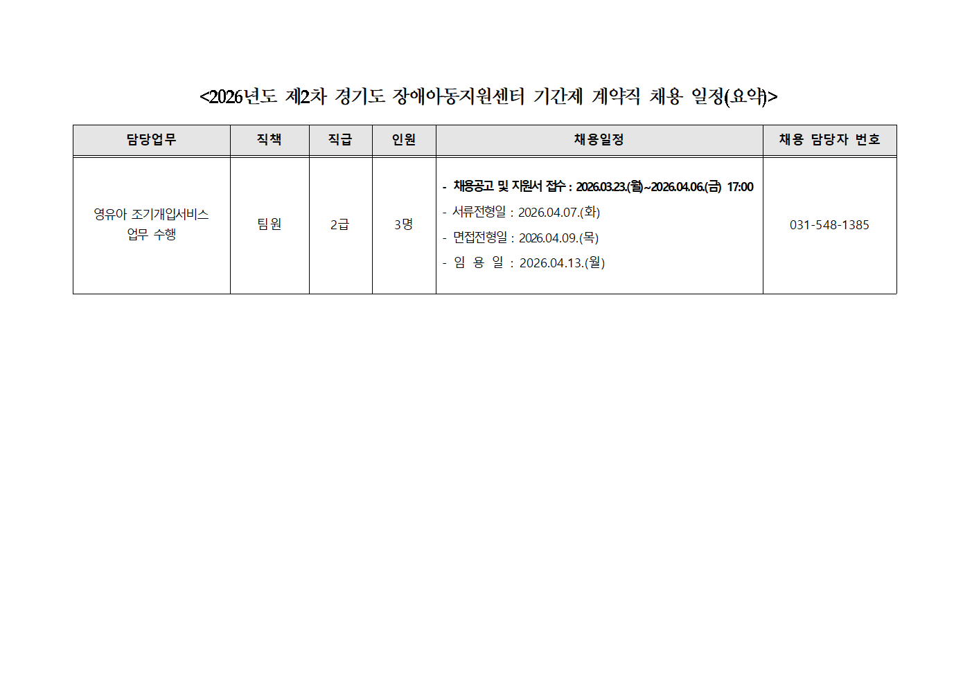 외부공지 2026년 4월 지역장애아동지원센터(경기대구) 기간제 계약직 채용 2026.03.26 조회수 657 취업지원팀 share facebook twitter kakaotalk 카카오톡 앱이설치된 모바일 기기에서만공유 가능합니다. https://www.syu.ac.kr/mzvj share 복사 붙임-1.-장애아동지원센터-사업-개요.hwp (97.5 KB) 붙임-2.-2026년-4월-지역장애아동지원센터경기대구-채용일정.hwp (31.5 KB) facebook twitter kakaotalk 카카오톡 앱이설치된 모바일 기기에서만공유 가능합니다. 이전글 글이 없습니다. 다음글 행사2026년 국제인도법 시네마 토크 행사(4. 4.) 안내 목록