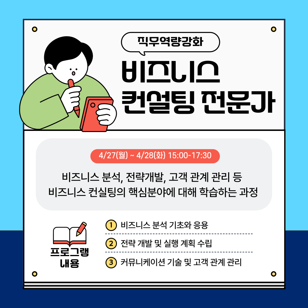- 4/27(월) ~ 4/28(화) 15:00-17:30  비즈니스 컨설팅 전문가 과정  (1일 2.5시간, 총 5시간)