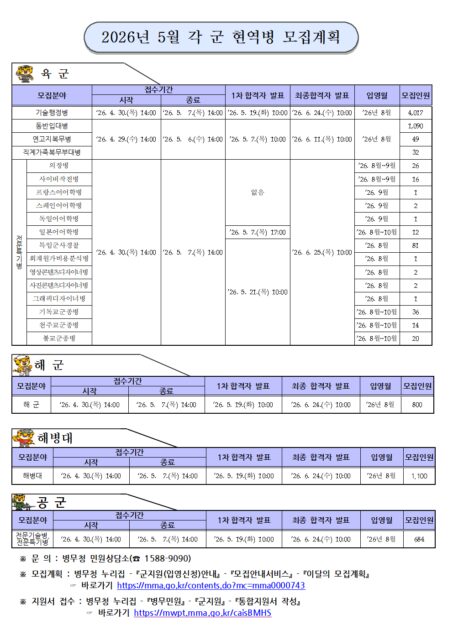 생활공지 모집 2026년 5월 각 군 현역병 모집계획 2026.04.27 조회수 2 예비군대대 share facebook twitter kakaotalk 카카오톡 앱이설치된 모바일 기기에서만공유 가능합니다. https://www.syu.ac.kr/henm share 복사 26년-5월-각-군-현역병-모집계획배부용.hwpx (1.4 MB) facebook twitter kakaotalk 카카오톡 앱이설치된 모바일 기기에서만공유 가능합니다. 이전글 글이 없습니다. 다음글 모집2026년 전반기 전문사관(전산 및 사어버특기) 장교 선발 안내 목록