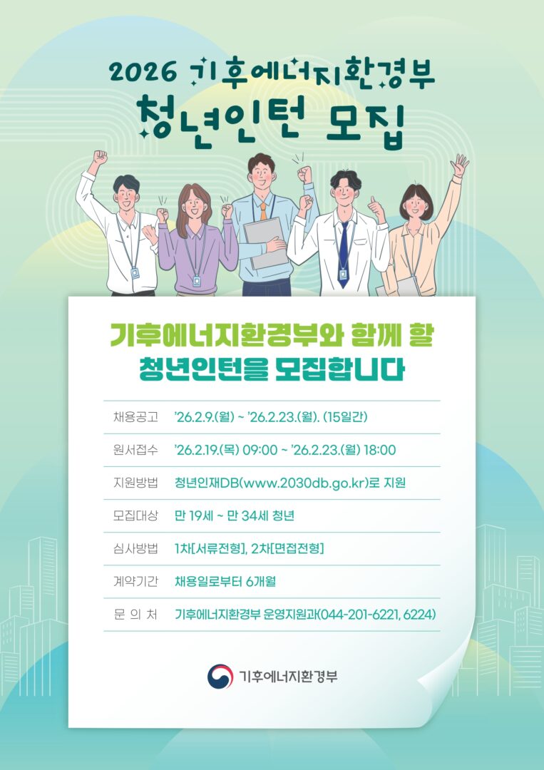 외부공지 2026 기후에너지환경부 청년인턴 모집 2026.02.04 조회수 246 취업지원팀 share facebook twitter kakaotalk 카카오톡 앱이설치된 모바일 기기에서만공유 가능합니다. https://www.syu.ac.kr/v3m2 share 복사 facebook twitter kakaotalk 카카오톡 앱이설치된 모바일 기기에서만공유 가능합니다. 이전글 2026 군산문화관광재단 기간제,단시간근로자[군산시민예술촌] 채용 모집공고 다음글 2026년 제2회 계약관리사 자격시험안내 목록