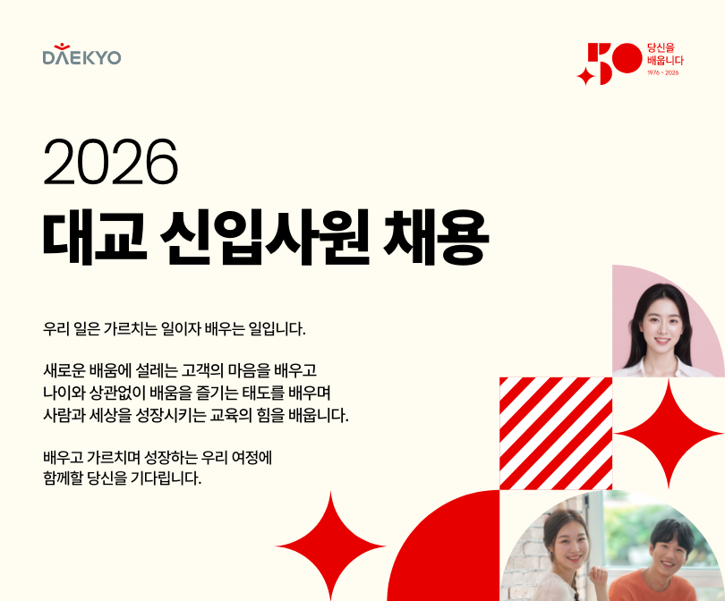 외부공지 2026 대교 신입사원 채용 안내 2026.04.08 조회수 681 취업지원팀 share facebook twitter kakaotalk 카카오톡 앱이설치된 모바일 기기에서만공유 가능합니다. https://www.syu.ac.kr/46jp share 복사 채용사이트 : https://jrs.jobkorea.co.kr/daekyo facebook twitter kakaotalk 카카오톡 앱이설치된 모바일 기기에서만공유 가능합니다. 이전글 글이 없습니다. 다음글 세종도시교통공사 2026년 제2회 직원(일반직) 채용 공고 목록