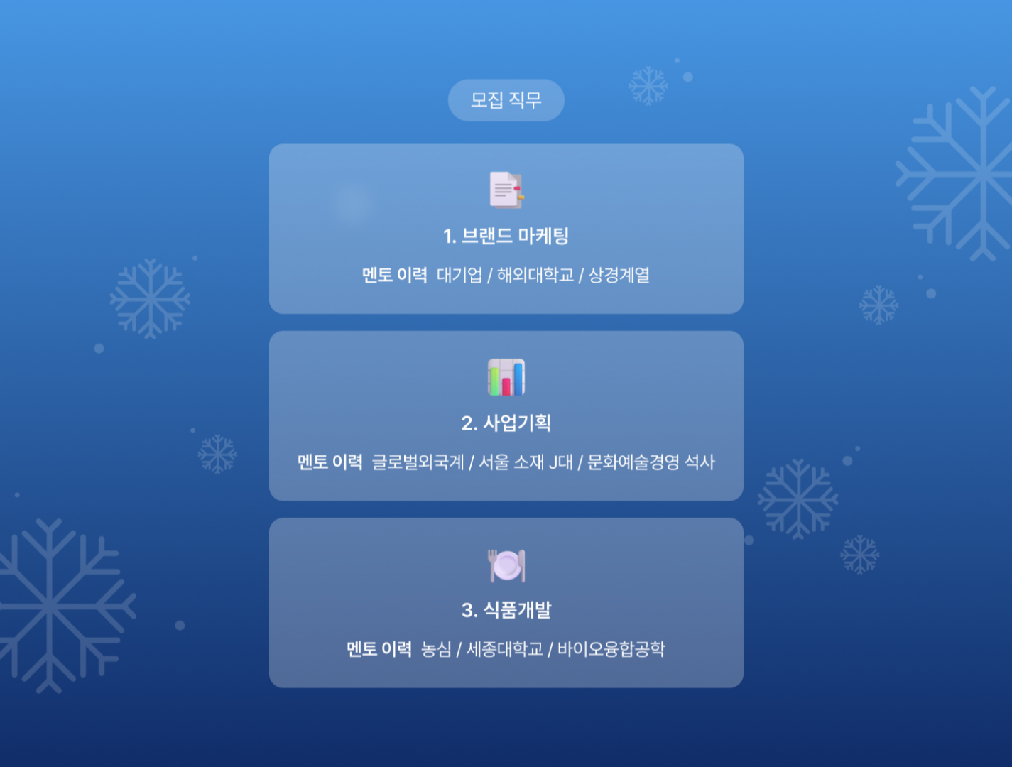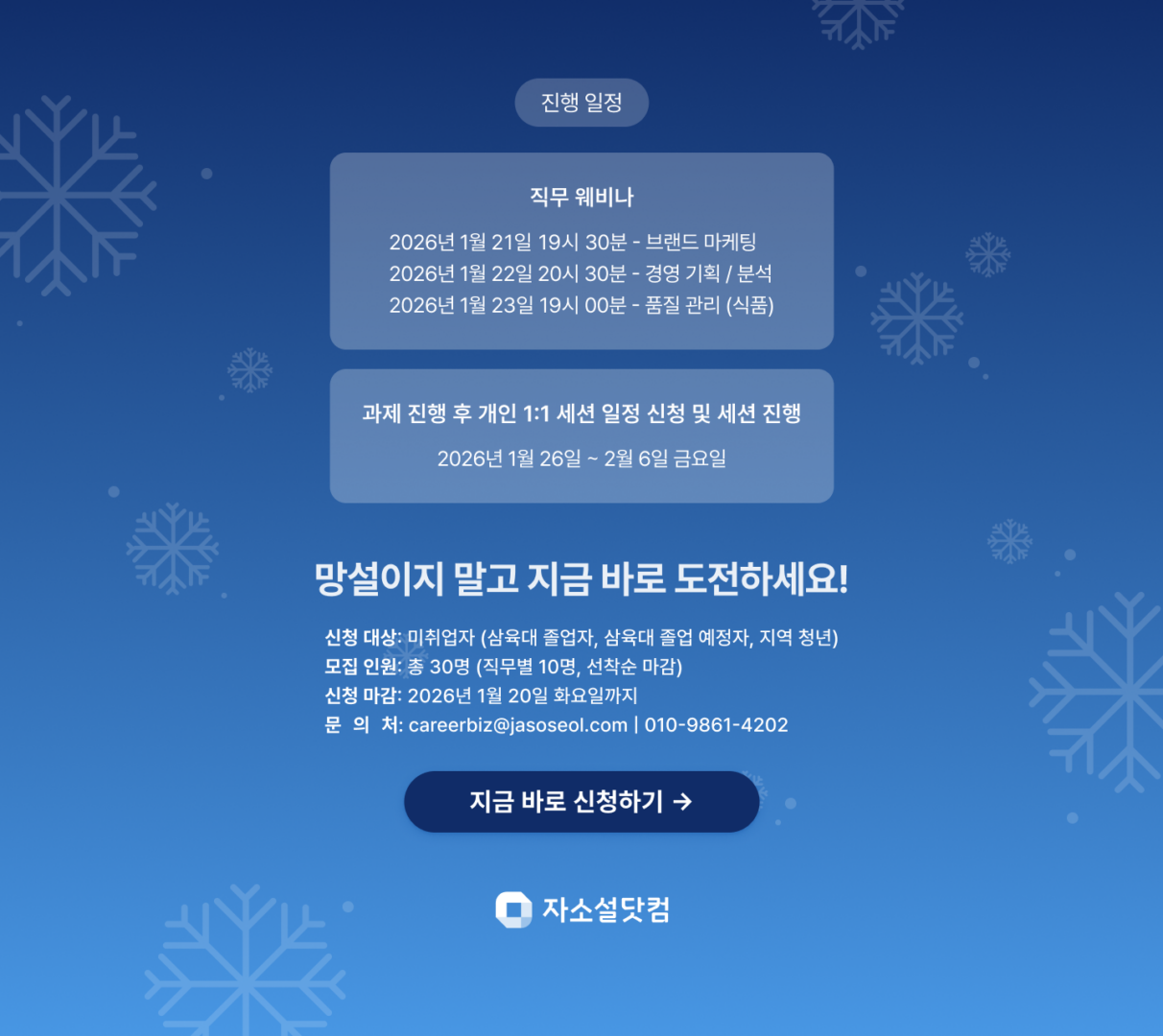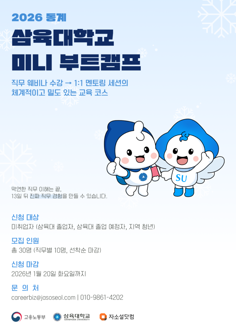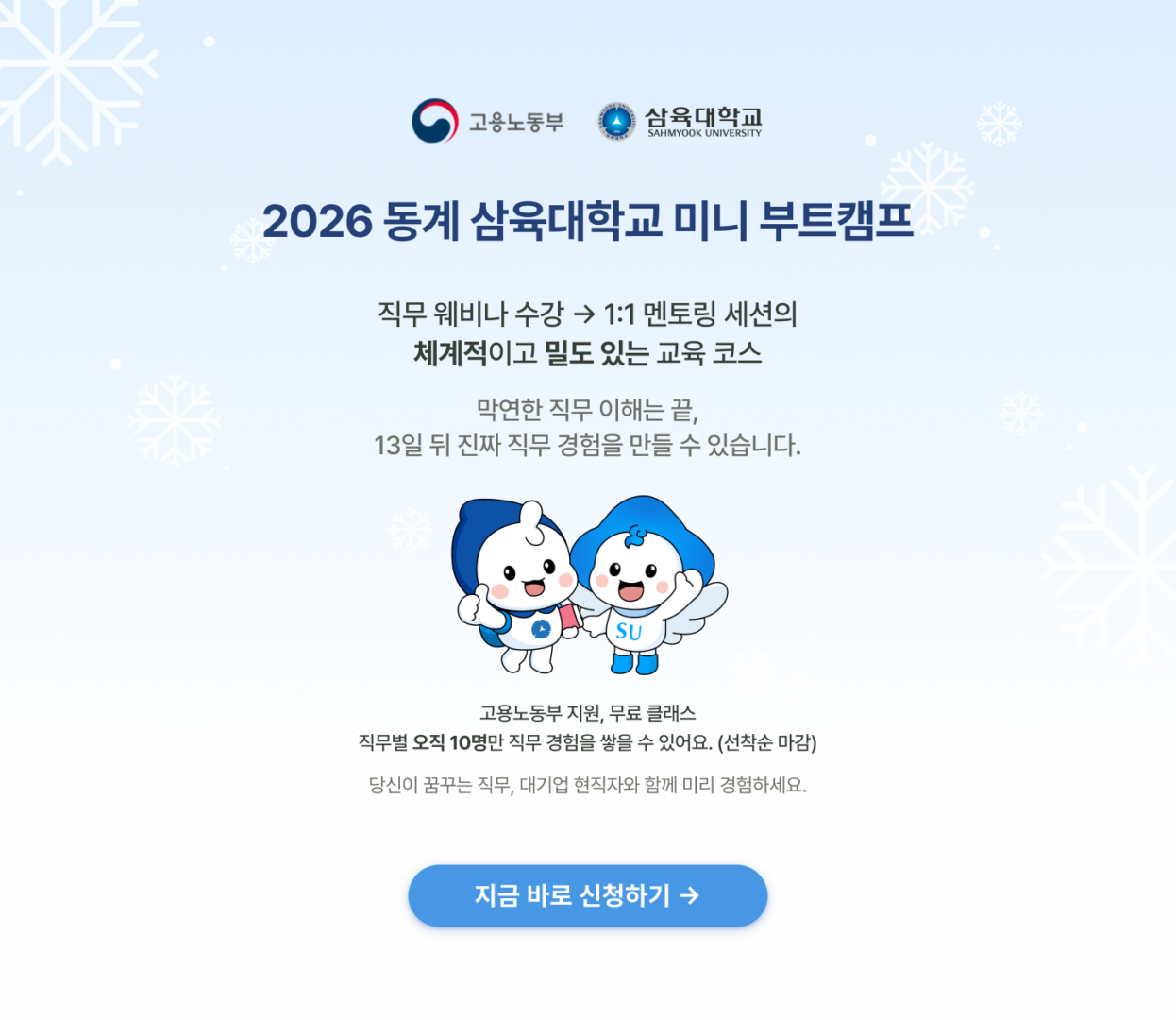 취업·창업공지 모집 2026 동계 삼육대학교 미니 부트캠프 2026.01.15 조회수 52 취업지원팀 share facebook twitter kakaotalk 카카오톡 앱이설치된 모바일 기기에서만공유 가능합니다. https://www.syu.ac.kr/7m73 share 복사 facebook twitter kakaotalk 카카오톡 앱이설치된 모바일 기기에서만공유 가능합니다. 이전글 글이 없습니다. 다음글 창업창업정부지원사업 준비 프로그램 참가자 모집 목록