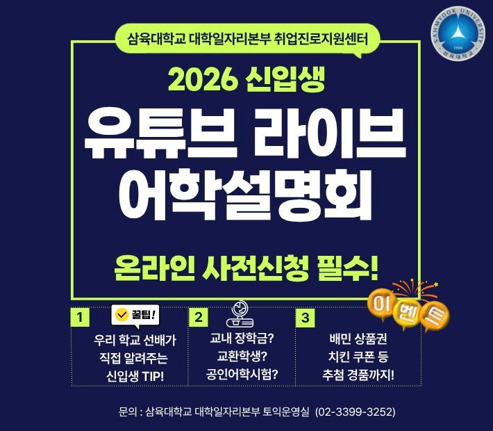 삼육대학교 대학일자리본부에서는 2026학년도 신입생을 위하여 “유튜브 라이브 신입생 어학설명회”를 마련했습니다.