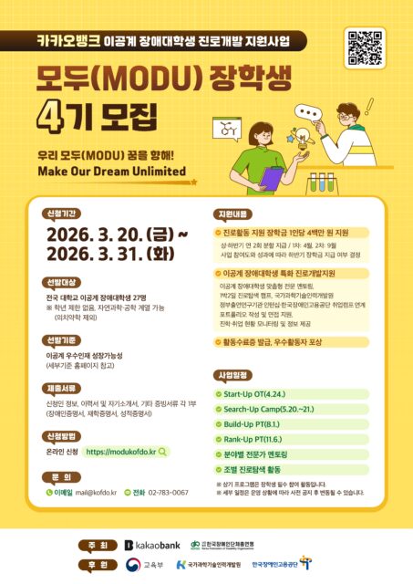 [한국장총] 2026 이공계 장애대학생 진로개발 지원사업 웹포스터(최종) [한국장총] 2026 이공계 장애대학생 진로개발 지원사업 웹포스터(최종) 2026.03.20 조회수 0 취업지원팀 share facebook twitter kakaotalk 카카오톡 앱이설치된 모바일 기기에서만공유 가능합니다. https://www.syu.ac.kr/?p=241627 share 복사 facebook twitter kakaotalk 카카오톡 앱이설치된 모바일 기기에서만공유 가능합니다. 이전글 글이 없습니다. 다음글 글이 없습니다. 목록