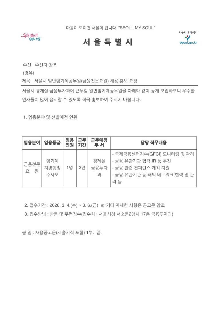 외부공지 2026.02.19 조회수 115 취업지원팀 share facebook twitter kakaotalk 카카오톡 앱이설치된 모바일 기기에서만공유 가능합니다. https://www.syu.ac.kr/n17d share 복사 삼육대학교-2026-01901.pdf (74.4 KB) 서울시-일반임기제공무원금융전문요원-채용-홍보-요청.pdf (119.8 KB) 채용공고문.hwpx (400.5 KB) facebook twitter kakaotalk 카카오톡 앱이설치된 모바일 기기에서만공유 가능합니다. 이전글 글이 없습니다. 다음글 2026년 화학물질 안전관리 전문인력 양성사업 교육생 모집 공고 목록