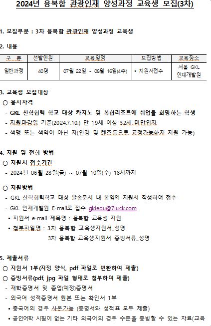 취업·창업공지 24년 융복합 관광인재 양성을 위한 교육생 모집 안내 2024.07.02 조회수 1,446 취업지원팀 share facebook twitter kakaotalk 카카오톡 앱이설치된 모바일 기기에서만공유 가능합니다. https://www.syu.ac.kr/?p=207684 share 복사 붙임_1._2024년_융복합_관광인재_양성과정_교육생모집_공고-1.hwp (58.5 KB) 붙임_2._2024년_융복합_관광인재_양성과정_교육생_지원서-3차.hwp (62.5 KB) facebook twitter kakaotalk 카카오톡 앱이설치된 모바일 기기에서만공유 가능합니다. 이전글 모집[삼육대학교 SU-Maker] ‘백드롭 실크플라워’ 만들기 메이커프로그램 참여자 모집 다음글 인제대학교 정규직 직원 신규채용 안내 목록