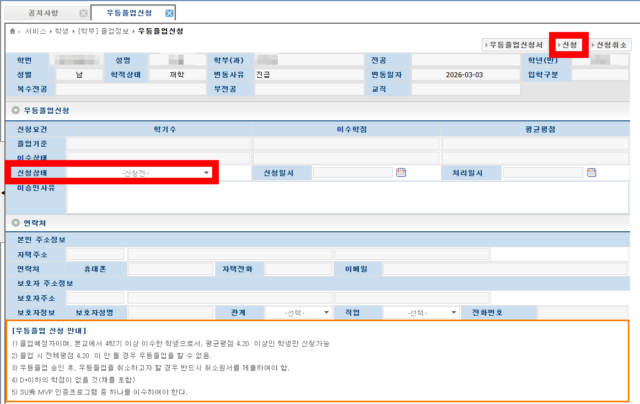 | 1️⃣ SU-WINGs [학생] → 학사정보 → 졸업정보 → 우등졸업신청 2️⃣ 학적정보 확인, 신청 버튼 클릭 3️⃣ 신청 완료 후 상태를 확인