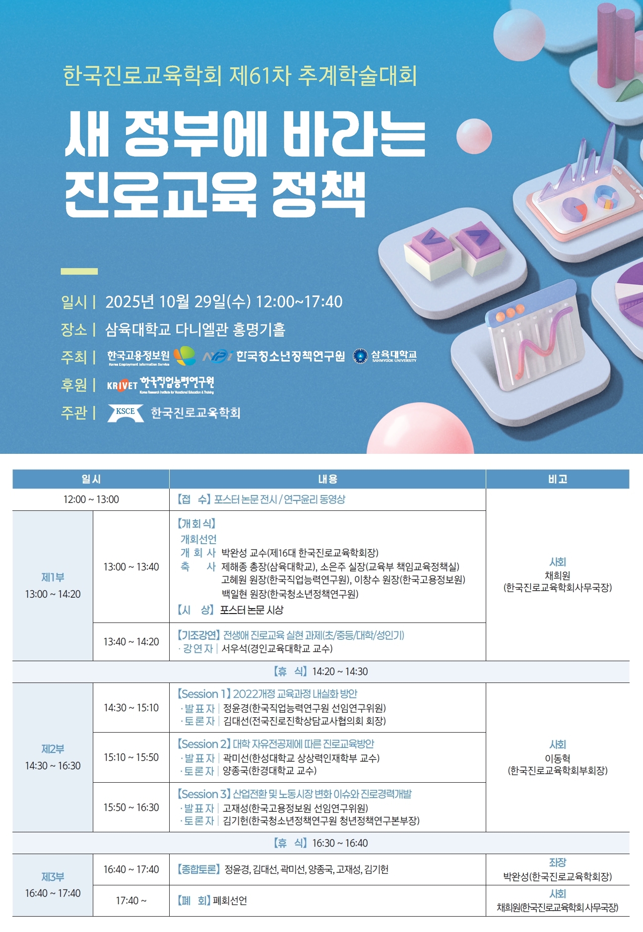 삼육대, 한국고용정보원, 한국청소년정책연구원이 주최하고 한국진로교육학회가 주관하며, 한국직업능력연구원이 후원하는 이번 학술대회는 급변하는 사회·산업 환경 속에서 진로교육의 정책적 방향을 모색하고, 새 정부 출범 이후의 주요 현안과 과제를 종합적으로 논의하기 위해 마련됐다.