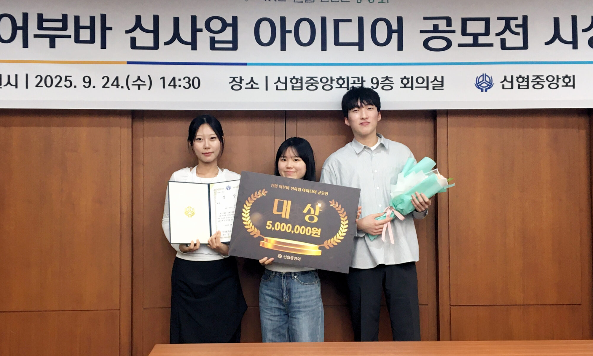 ▲ (왼쪽부터) 경영학과 유나현(23학번), 임가현(23학번), 김민성(21학번) 학우가 지난 9월 24일 대전 신협중앙회관 회의실에서 열린 공모전 시상식에서 기념사진을 촬영하고 있다.