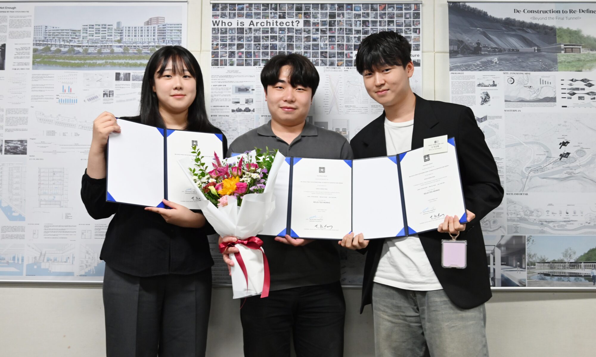 ▲ 지난 9월 19일 서울 중구 퇴계로 공간종합건축사사무소 사옥에서 열린 ‘제38회 공간국제학생건축상’ 시상식에서 (왼쪽부터) 건축학과 김세연, 정현선, 이건희 학우가 기념촬영을 하고 있다.