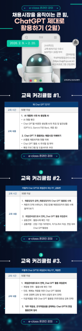 원하는 시간에 이클래스(e-class)에서 ChatGPT를 배울 수 있는 프로그램이니 많은 참여 바랍니다.