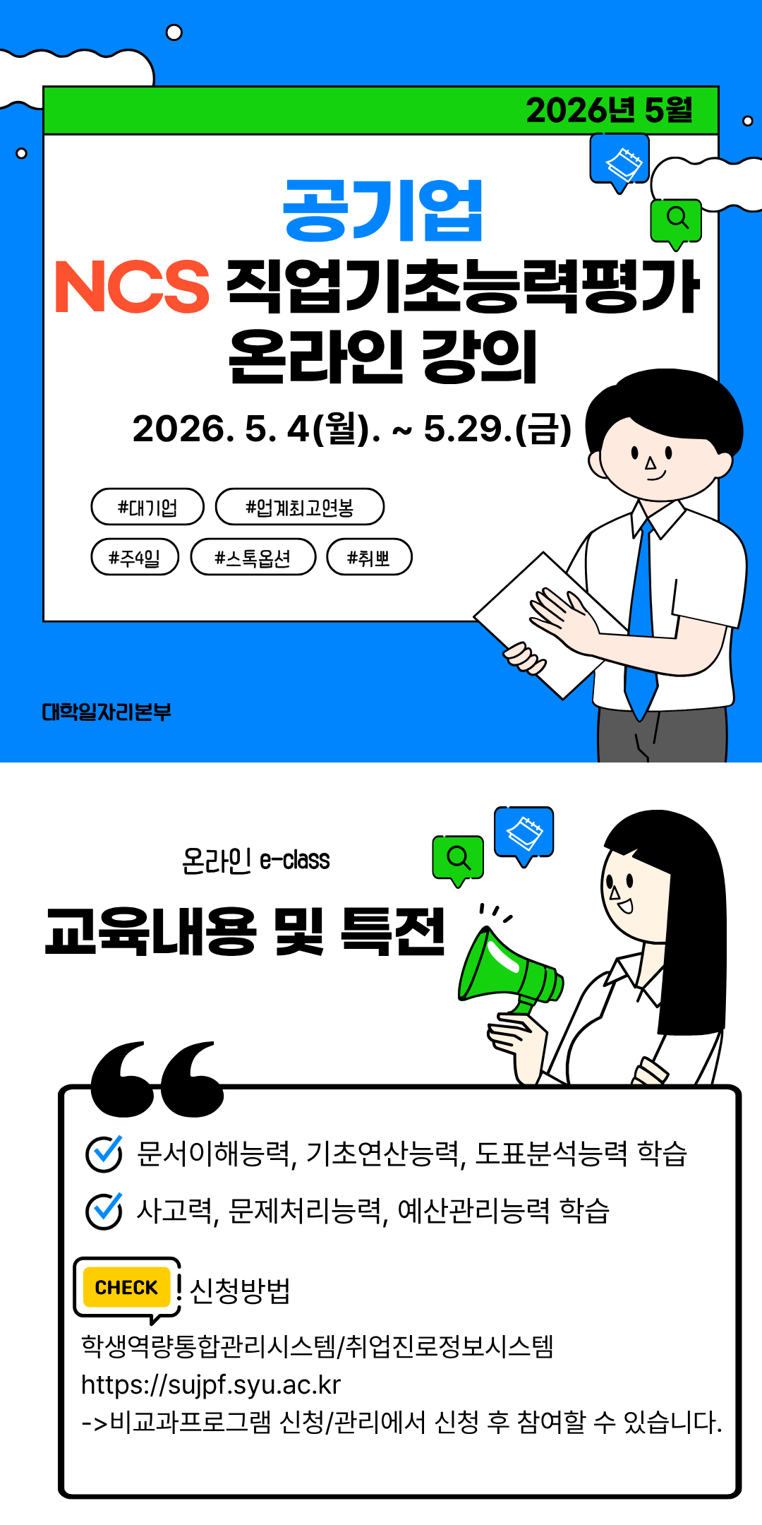 공기업 NCS직업기초 5월 공기업 NCS직업기초 5월 2026.04.09 조회수 0 취업지원팀 share facebook twitter kakaotalk 카카오톡 앱이설치된 모바일 기기에서만공유 가능합니다. https://www.syu.ac.kr/?p=243141 share 복사 facebook twitter kakaotalk 카카오톡 앱이설치된 모바일 기기에서만공유 가능합니다. 이전글 글이 없습니다. 다음글 글이 없습니다. 목록