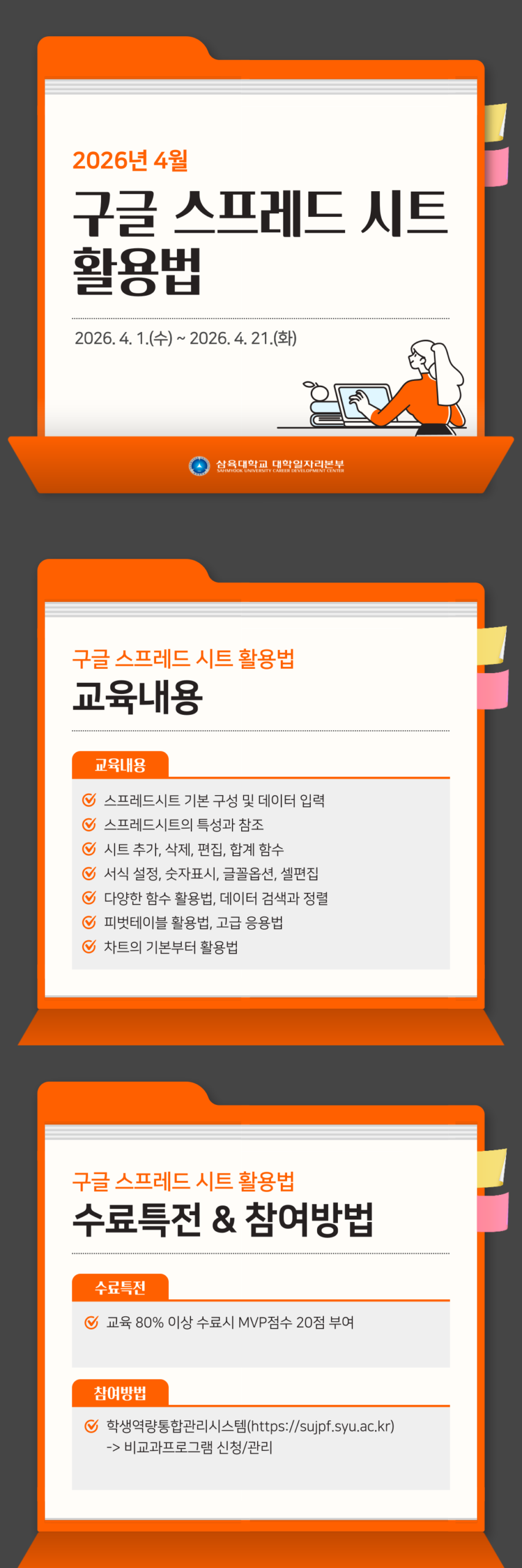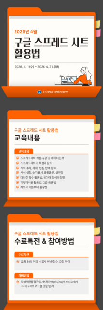 구글스프레드시트활용법_4월 구글스프레드시트활용법_4월 2026.03.20 조회수 0 취업지원팀 share facebook twitter kakaotalk 카카오톡 앱이설치된 모바일 기기에서만공유 가능합니다. https://www.syu.ac.kr/?p=241704 share 복사 facebook twitter kakaotalk 카카오톡 앱이설치된 모바일 기기에서만공유 가능합니다. 이전글 글이 없습니다. 다음글 글이 없습니다. 목록