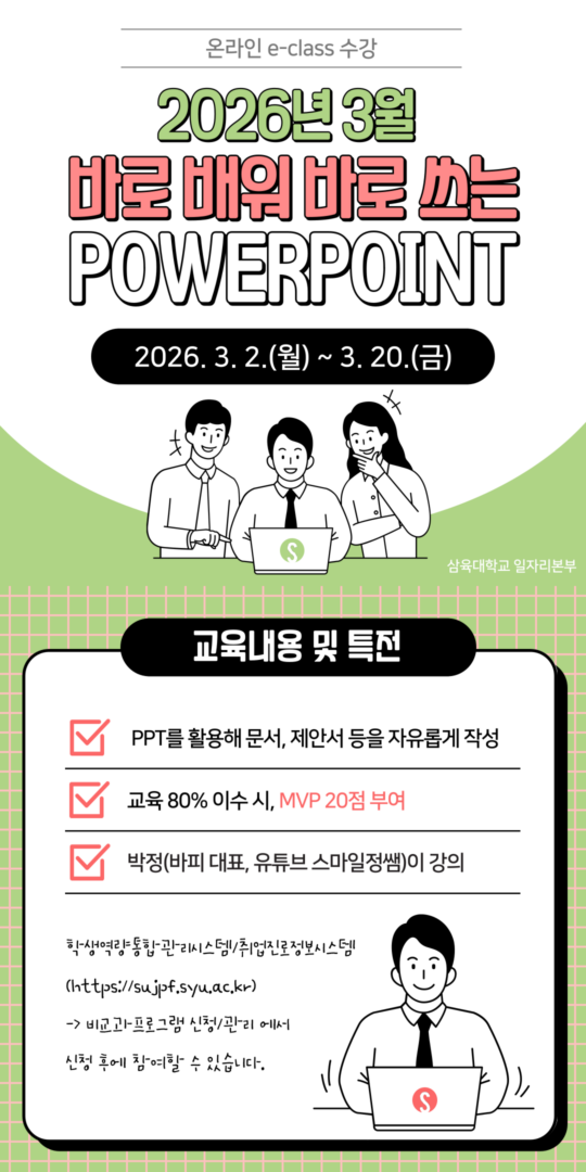 *신청(~3/13):학생통합역량관리시스템(https://sujpf.syu.ac.kr)  -비교과프로그램