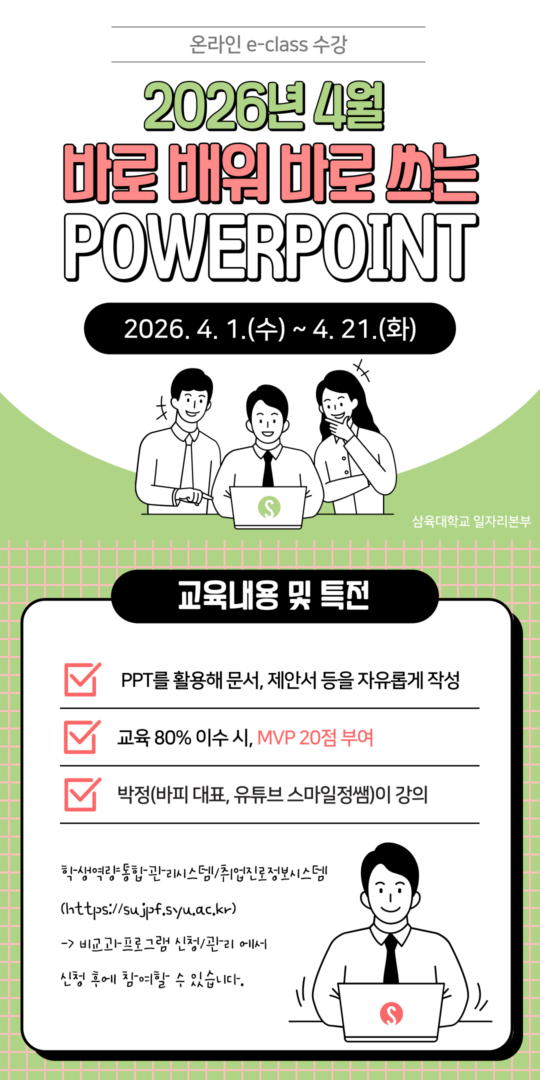 *신청(~4/3):학생통합역량관리시스템(https://sujpf.syu.ac.kr) -비교과프로그램