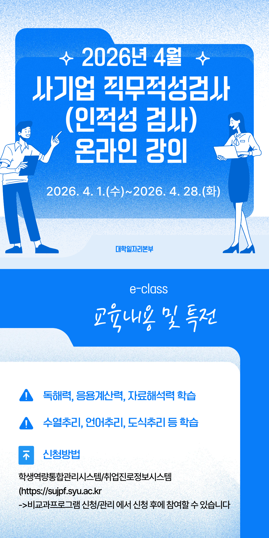 사기업 직무적성검사_4월 사기업 직무적성검사_4월 2026.03.20 조회수 0 취업지원팀 share facebook twitter kakaotalk 카카오톡 앱이설치된 모바일 기기에서만공유 가능합니다. https://www.syu.ac.kr/?p=241688 share 복사 facebook twitter kakaotalk 카카오톡 앱이설치된 모바일 기기에서만공유 가능합니다. 이전글 글이 없습니다. 다음글 글이 없습니다. 목록