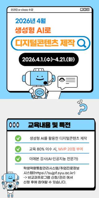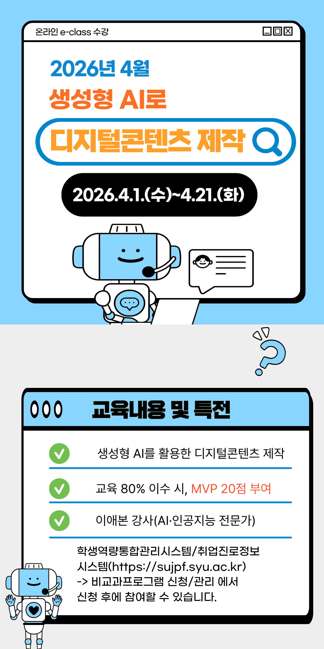 디지털콘텐츠제작 4월 디지털콘텐츠제작 4월 2026.03.20 조회수 0 취업지원팀 share facebook twitter kakaotalk 카카오톡 앱이설치된 모바일 기기에서만공유 가능합니다. https://www.syu.ac.kr/?p=241710 share 복사 facebook twitter kakaotalk 카카오톡 앱이설치된 모바일 기기에서만공유 가능합니다. 이전글 글이 없습니다. 다음글 글이 없습니다. 목록