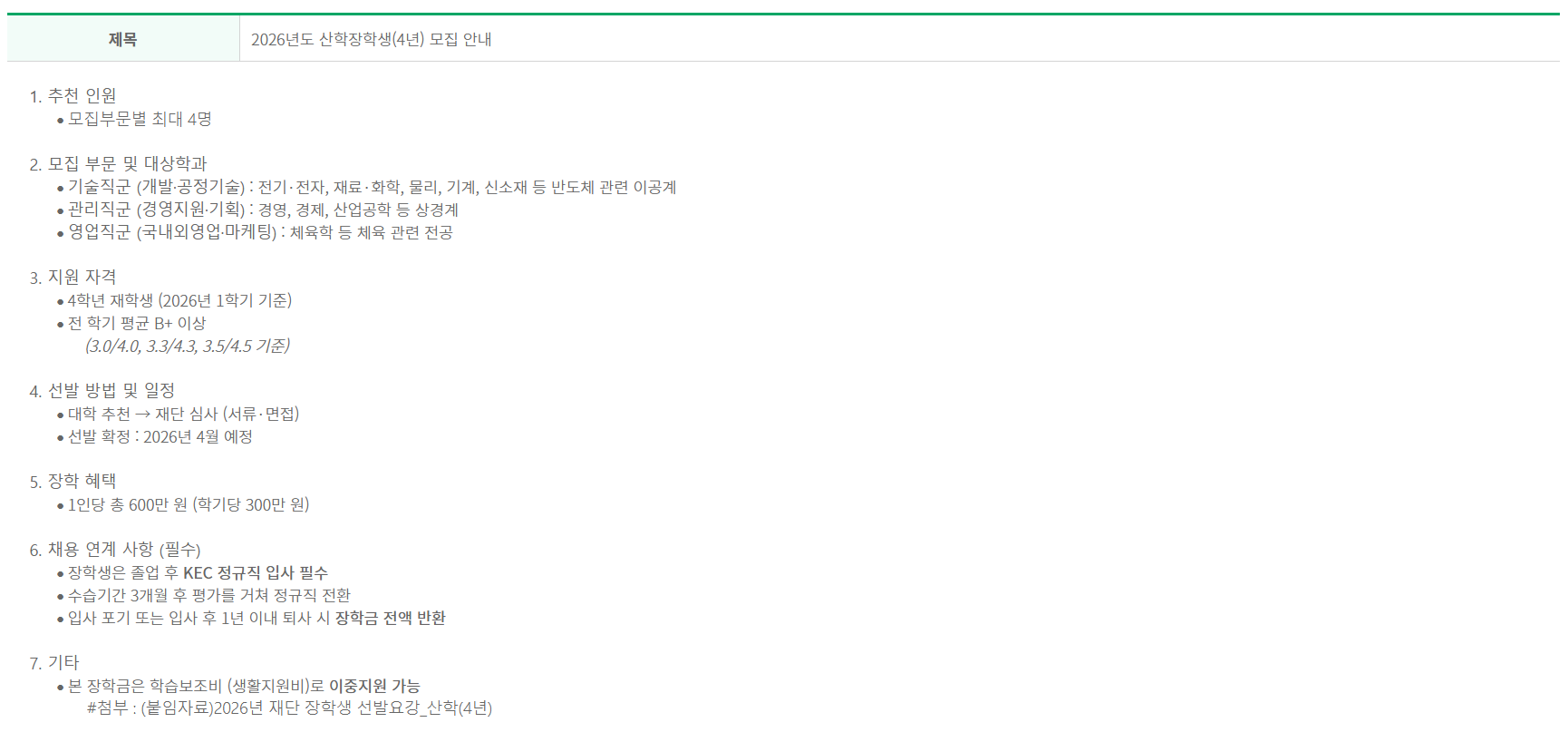 I 2026년도 KEC과학교육재단 산학장학생 후보자 모집 안내 I