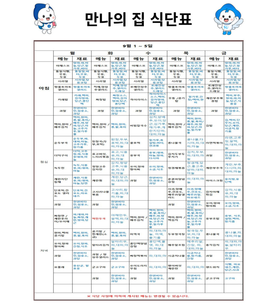 만나의 집 식단표 PRINT 만나의 집 식단표(2025.09.01~2025.09.05) 2025.09.01 조회수 103 생활관 share facebook twitter kakaotalk 카카오톡 앱이설치된 모바일 기기에서만공유 가능합니다. https://www.syu.ac.kr/dorm/%eb%a7%8c%eb%82%98%ec%9d%98-%ec%a7%91-%ec%8b%9d%eb%8b%a8%ed%91%9c2025-09-012025-09-05/ 복사 << 만나의 집 이용 시간 >> 아침 07:40 ~ 08:50 / 점심 11:50 ~ 13:40 / 저녁 17:00 ~ 18:30 facebook twitter kakaotalk 카카오톡 앱이설치된 모바일 기기에서만공유 가능합니다. 이전글 만나의 집 식단표(2025.09.08~2025.09.12) 다음글 만나의 집 식단표(2025.06.09~2025.06.13) 목록 담당부서 생활교육원 전화번호 브니엘관02-3399-3679 살렘관3662 시온관3667 에덴관3668 이메일 house@syu.ac.kr 최종수정일: 2025.09.11