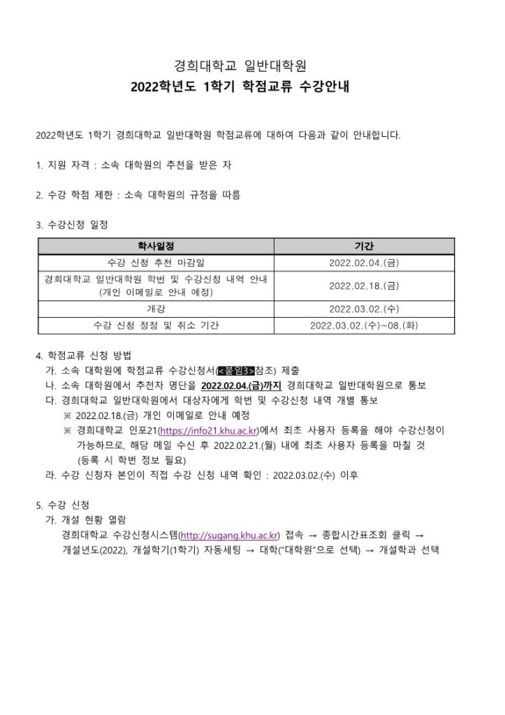 학사공지 / Notice PRINT 수업 2022학년도 1학기 경희대학교 일반대학원 학점교류 수강안내 2022.01.14 조회수 3,582 대학원 share facebook twitter kakaotalk 카카오톡 앱이설치된 모바일 기기에서만공유 가능합니다. https://www.syu.ac.kr/grad/2022%ed%95%99%eb%85%84%eb%8f%84-1%ed%95%99%ea%b8%b0-%ea%b2%bd%ed%9d%ac%eb%8c%80%ed%95%99%ea%b5%90-%ec%9d%bc%eb%b0%98%eb%8c%80%ed%95%99%ec%9b%90-%ed%95%99%ec%a0%90%ea%b5%90%eb%a5%98-%ec%88%98%ea%b0%95/ 복사 붙임3.-2022학년도-1학기-학점교류-수강신청서-양식경희대학교-일반대학원.hwp (70.5 KB) facebook twitter kakaotalk 카카오톡 앱이설치된 모바일 기기에서만공유 가능합니다. 이전글 수업2022학년도 1학기 숙명여자대학교 대학원 학점교류 안내 다음글 학사2022-1 휴학 복학 신청 안내 목록 담당부서 교학팀 전화번호 02-3399-3016 이메일 graduate@syu.ac.kr 최종수정일 : 2022.01.14