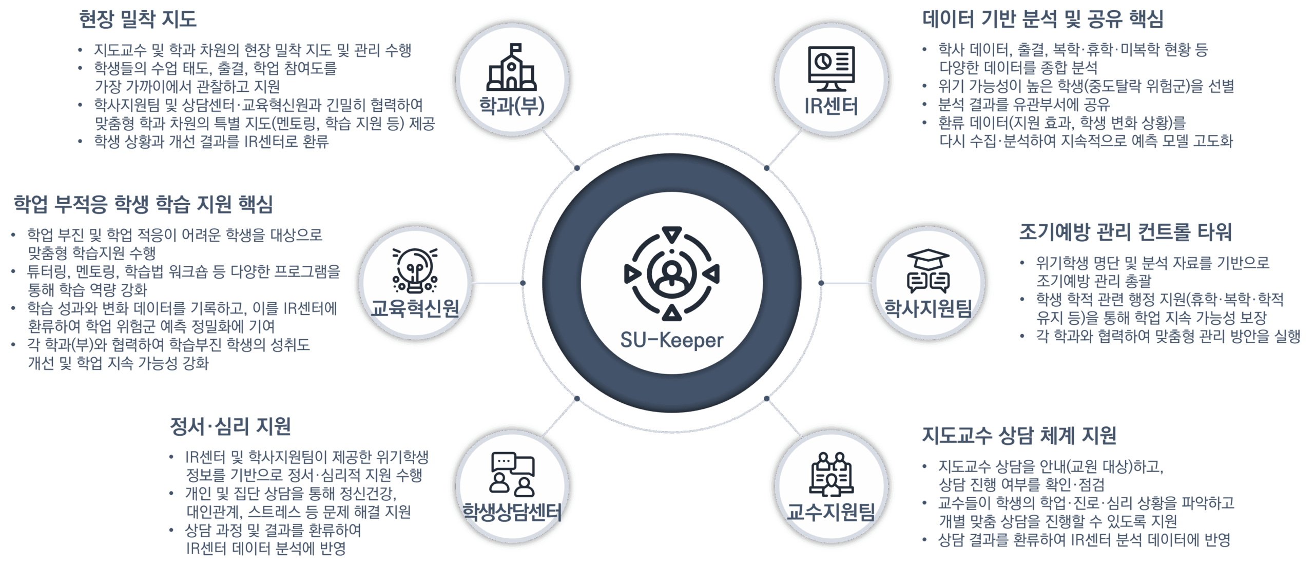 SU-Keeper 시스템은 인공지능(AI) 분석을 기반으로 학사, 출결, 성적, 심리, 학업 적응 등 다양한 데이터를 종합적으로 분석하여 중도탈락 위험이 있는 학생을 조기에 선별하고, 관련 부서와 협력하여 체계적으로 지원하는 선진 관리 체계입니다.