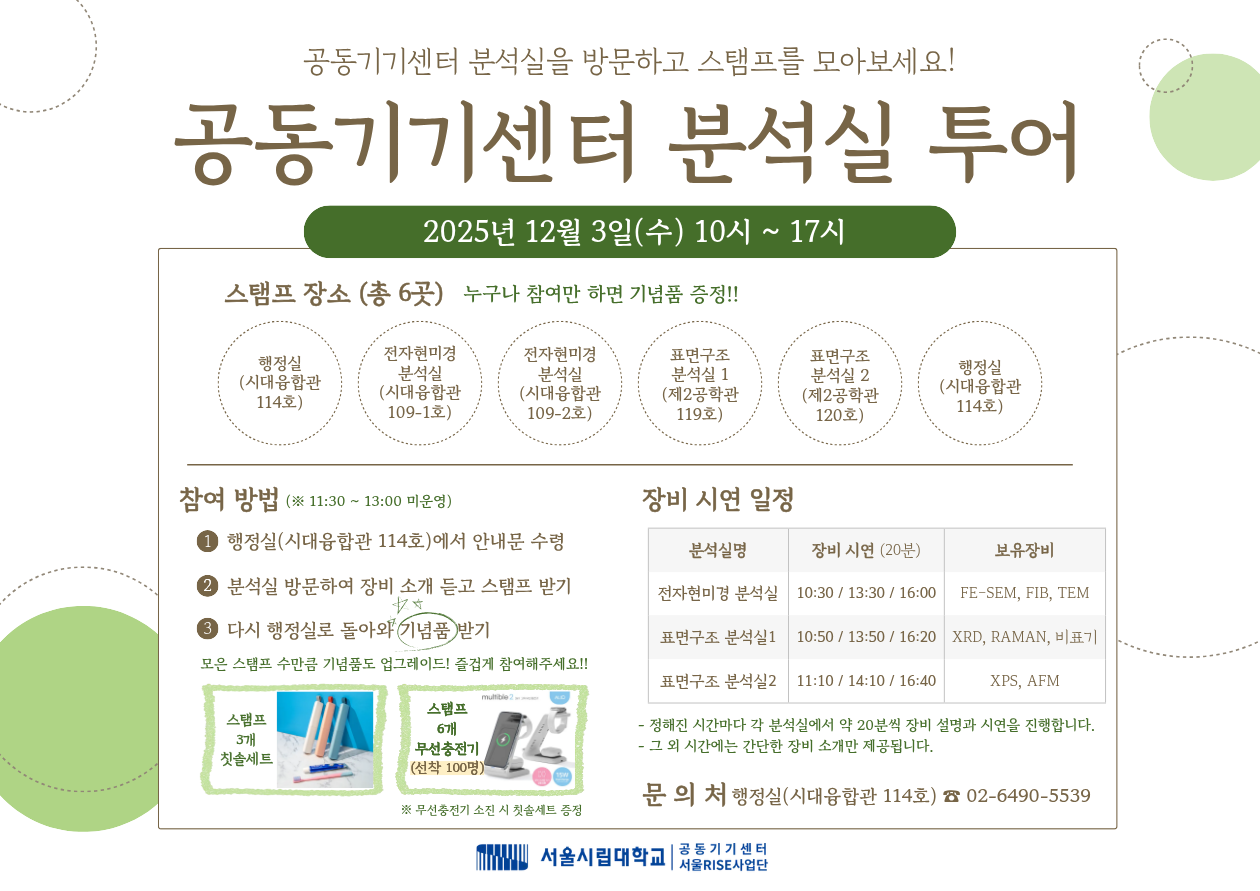 공지사항 PRINT 서울시립대학교 공동기기센터 분석실 투어 안내 2025.12.02 조회수 89 공통기기실험실 share facebook twitter kakaotalk 카카오톡 앱이설치된 모바일 기기에서만공유 가능합니다. https://www.syu.ac.kr/lab/%ec%84%9c%ec%9a%b8%ec%8b%9c%eb%a6%bd%eb%8c%80%ed%95%99%ea%b5%90-%ea%b3%b5%eb%8f%99%ea%b8%b0%ea%b8%b0%ec%84%bc%ed%84%b0-%eb%b6%84%ec%84%9d%ec%8b%a4-%ed%88%ac%ec%96%b4/ 복사 서울시립대학교-공동기기센터-투어.png (236.5 KB) 활용교육안내.png (135.8 KB) facebook twitter kakaotalk 카카오톡 앱이설치된 모바일 기기에서만공유 가능합니다. 이전글 글이 없습니다. 다음글 분석의뢰를 위한 외부 기관 연구원 홈페이지 가입안내 목록 연구자 여러분들의 성공적인 연구를 기원합니다. 공통기기실