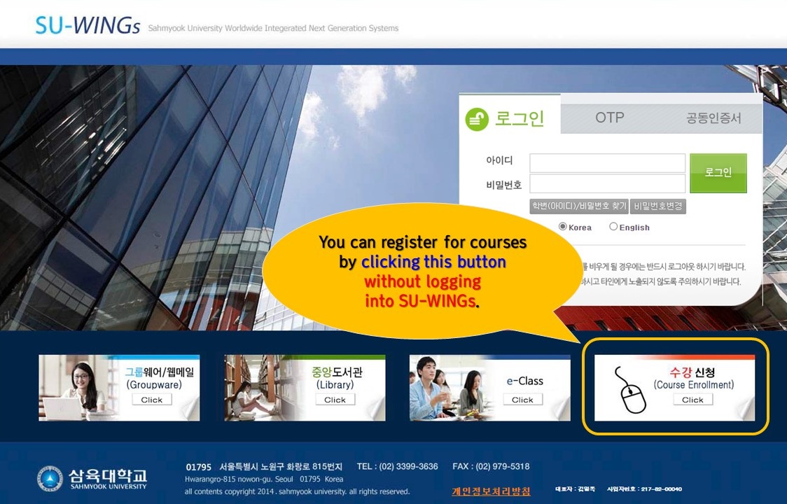 ④ You can check the course catalog in real-time by logging into SU-WINGs and navigating to [Graduate School] Course Information ([대학원]]수업정보) -> Print Course Catalog(수강편람 출력). Please be aware that the course catalog may be subject to real-time changes based on the department’s circumstances. We recommend checking it directly on SU-WINGs.