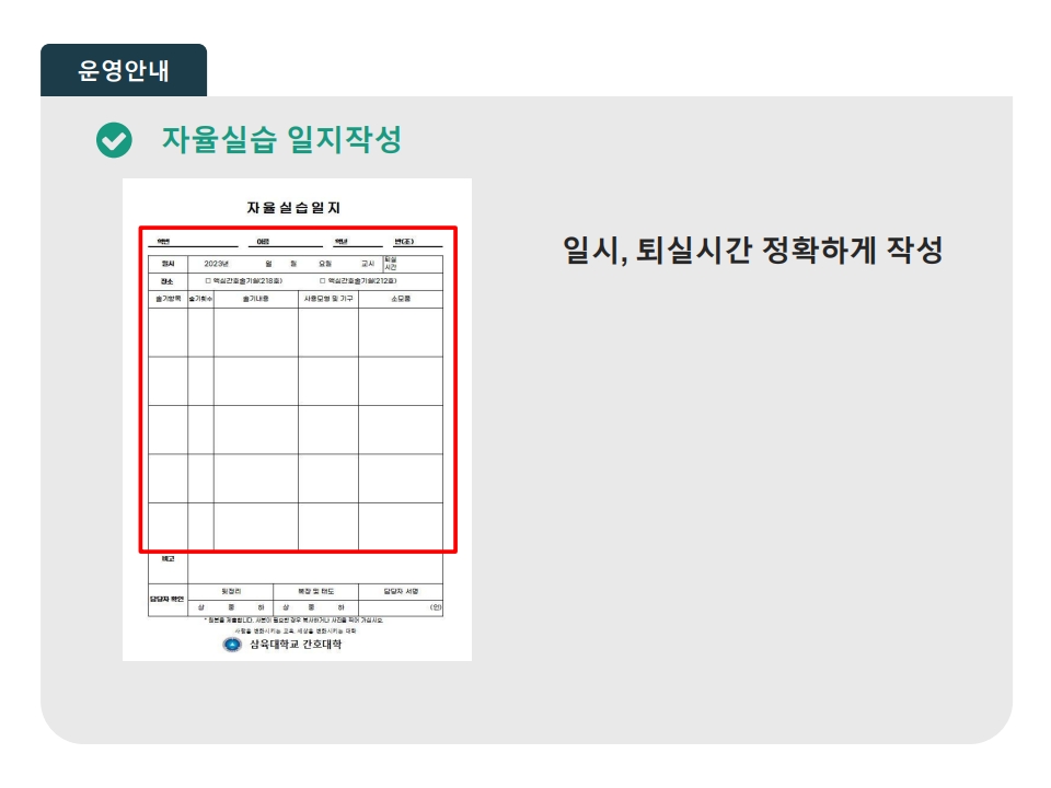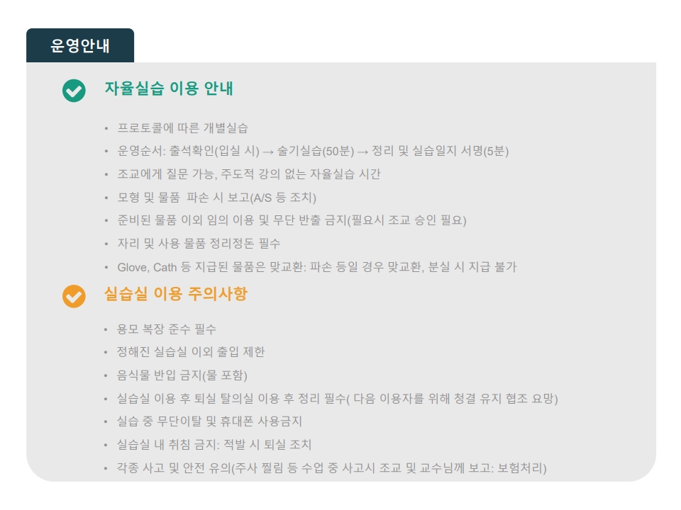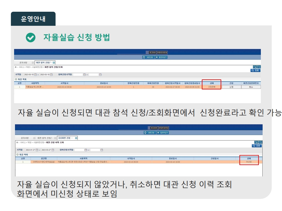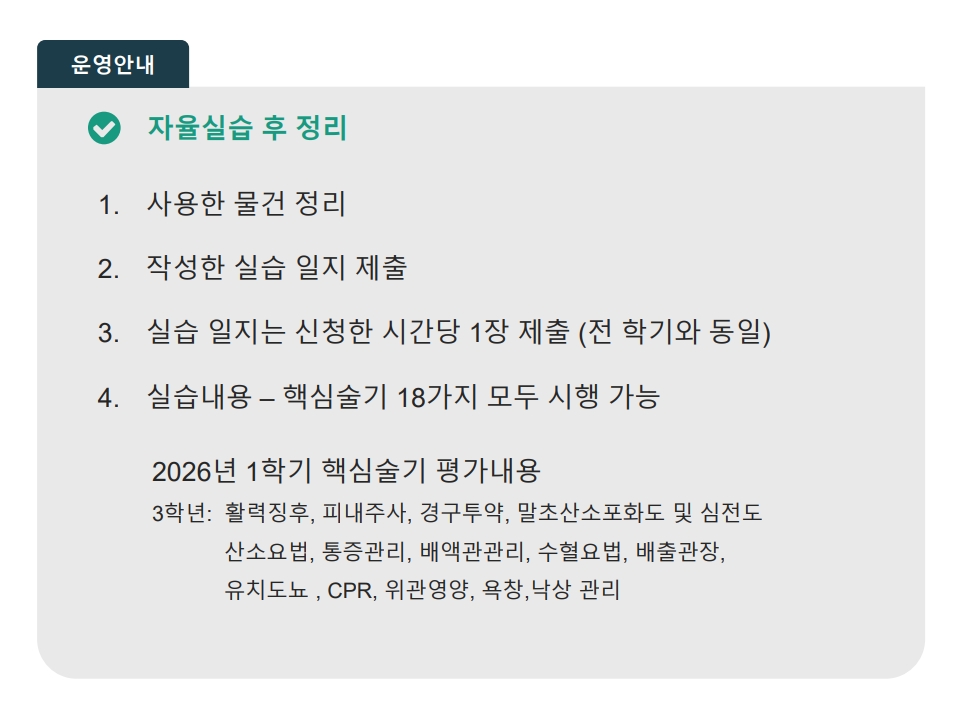 3학년 학생의 경우 임상간호 입문, 지역사회간호학 실습 평가일은 자율실습을 신청에 주의하십시오.
