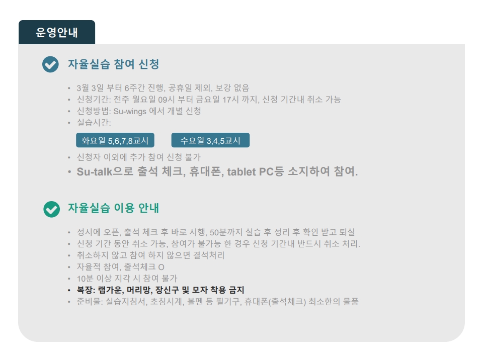 셋째주 이후 실습은 실습 전주 월요일 9AM부터 금요일 5PM시 까지 입니다.