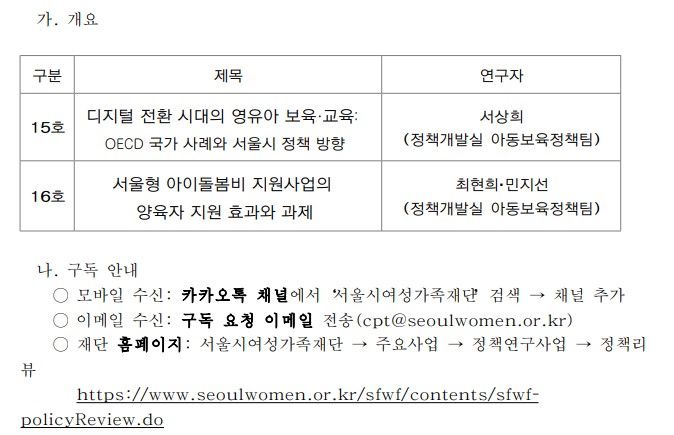 공지사항 PRINT 「서울시 여성가족정책 리뷰」 15호 및 16호 안내 2026.01.02 조회수 40 연구산학처 share facebook twitter kakaotalk 카카오톡 앱이설치된 모바일 기기에서만공유 가능합니다. https://www.syu.ac.kr/rnd/%e3%80%8c%ec%84%9c%ec%9a%b8%ec%8b%9c-%ec%97%ac%ec%84%b1%ea%b0%80%ec%a1%b1%ec%a0%95%ec%b1%85-%eb%a6%ac%eb%b7%b0%e3%80%8d-15%ed%98%b8-%eb%b0%8f-16%ed%98%b8-%ec%95%88/ 복사 서울시-여성가족정책-리뷰-15호-및-16호-홍보-요청_20260102.zip (1.4 MB) facebook twitter kakaotalk 카카오톡 앱이설치된 모바일 기기에서만공유 가능합니다. 이전글 글이 없습니다. 다음글 「서울시 여성가족정책 리뷰」 13호 및 14호 안내 목록 삼육대학교 산학협력단은 대학과 기업이 동반성장하는 기술개발 체제 인프라를 구축합니다. 삼육대학교 산학협력단