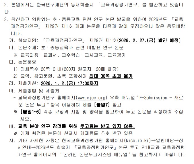 공지사항 PRINT 학술지 「교육과정평가연구」 제29권 제1호 게재 논문 모집 안내 2025.11.27 조회수 88 연구산학처 share facebook twitter kakaotalk 카카오톡 앱이설치된 모바일 기기에서만공유 가능합니다. https://www.syu.ac.kr/rnd/%ed%95%99%ec%88%a0%ec%a7%80-%e3%80%8c%ea%b5%90%ec%9c%a1%ea%b3%bc%ec%a0%95%ed%8f%89%ea%b0%80%ec%97%b0%ea%b5%ac%e3%80%8d-%ec%a0%9c29%ea%b6%8c-%ec%a0%9c1%ed%98%b8-%ea%b2%8c%ec%9e%ac-%eb%85%bc%eb%ac%b8/ 복사 학술지-교육과정평가연구-제29권-제1호-게재-논문-모집-안내_20251127.zip (2.4 MB) facebook twitter kakaotalk 카카오톡 앱이설치된 모바일 기기에서만공유 가능합니다. 이전글 「서울시 여성가족정책 리뷰」 9호 안내 다음글 학술지「Brain, Digital & Learning」제15권 4호 원고 모집 안내 목록 삼육대학교 산학협력단은 대학과 기업이 동반성장하는 기술개발 체제 인프라를 구축합니다. 삼육대학교 산학협력단