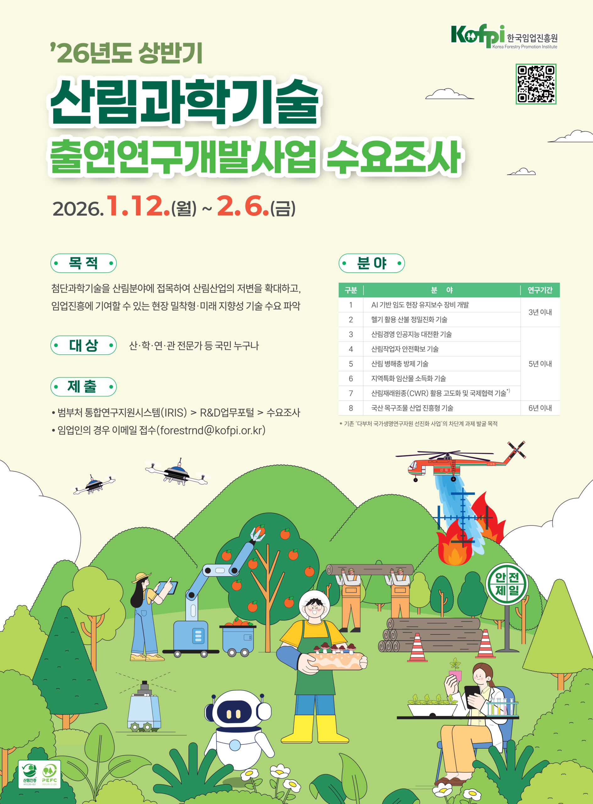 교외 연구과제 공모 PRINT [한국임업진흥원] ’26년도 상반기 산림과학기술 출연연구개발사업 기술수요조사 2026.01.14 조회수 12 산학협력단 share facebook twitter kakaotalk 카카오톡 앱이설치된 모바일 기기에서만공유 가능합니다. https://www.syu.ac.kr/rnd/%ed%95%9c%ea%b5%ad%ec%9e%84%ec%97%85%ec%a7%84%ed%9d%a5%ec%9b%90-26%eb%85%84%eb%8f%84-%ec%83%81%eb%b0%98%ea%b8%b0-%ec%82%b0%eb%a6%bc%ea%b3%bc%ed%95%99%ea%b8%b0%ec%88%a0-%ec%b6%9c%ec%97%b0%ec%97%b0/ 복사 2026년-상반기-산림과학기술-출연연구개발사업-수요조사-공고.hwp (64.5 KB) 수요조사-접수-서식-등.zip (170.3 KB) facebook twitter kakaotalk 카카오톡 앱이설치된 모바일 기기에서만공유 가능합니다. 이전글 글이 없습니다. 다음글 [서울특별시] 2025년 물산업 혁신기술 R&D 지원사업 안내 목록 삼육대학교 산학협력단은 대학과 기업이 동반성장하는 기술개발 체제 인프라를 구축합니다. 삼육대학교 산학협력단