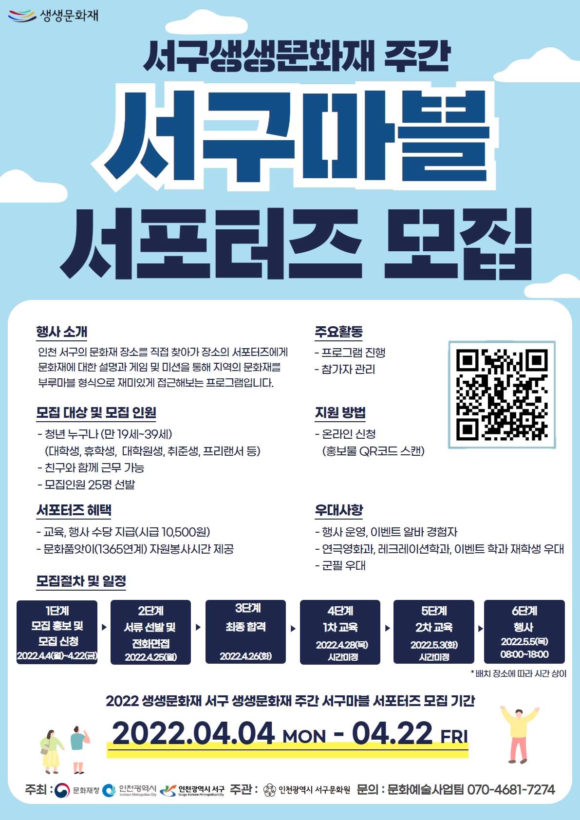 봉사신청 PRINT 2022 생생문화재 서구생생문화재 주간 서포터즈 모집공고 2022.04.07 조회수 711 글로컬사회혁신원 share facebook twitter kakaotalk 카카오톡 앱이설치된 모바일 기기에서만공유 가능합니다. https://www.syu.ac.kr/service/2022-%ec%83%9d%ec%83%9d%eb%ac%b8%ed%99%94%ec%9e%ac-%ec%84%9c%ea%b5%ac%ec%83%9d%ec%83%9d%eb%ac%b8%ed%99%94%ec%9e%ac-%ec%a3%bc%ea%b0%84-%ec%84%9c%ed%8f%ac%ed%84%b0%ec%a6%88-%eb%aa%a8%ec%a7%91%ea%b3%b5/ 복사 2022 생생문화재 서구생생문화재 주간 <서구마블> 서포터즈를 아래와 같이 모집합니다. (모집공고문을 참조하시어 신청해 주시기 바랍니다.) 생생문화재-주간-서구마블-서포터즈-포스터.jpg (602.5 KB) facebook twitter kakaotalk 카카오톡 앱이설치된 모바일 기기에서만공유 가능합니다. 이전글 2022년 디지털성범죄 모니터링 시민자원봉사단 모집 공고 다음글 ▶ 게시판 글쓰기/수정 문제발생시 조치, 웹 브라우저 최신 정보 로딩 방법 목록 세상을 변화시킬 꿈과 비전 삼육대학교 글로컬사회혁신원