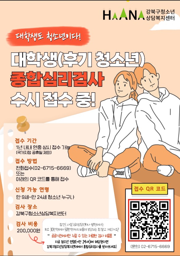 강북구 청소년 상담복지센터에서 대학생 대상 종합심리검사를 진행합니다.