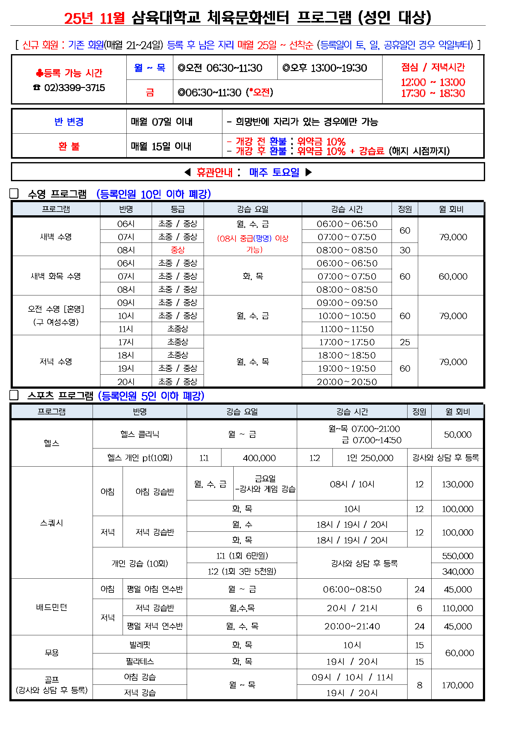 프로그램안내 PRINT 체육문화센터 정규 프로그램 (2025년 11월) 2025.10.17 조회수 844 sportscenter share facebook twitter kakaotalk 카카오톡 앱이설치된 모바일 기기에서만공유 가능합니다. https://www.syu.ac.kr/sportscenter/%ec%b2%b4%ec%9c%a1%eb%ac%b8%ed%99%94%ec%84%bc%ed%84%b0-%ec%a0%95%ea%b7%9c-%ed%94%84%eb%a1%9c%ea%b7%b8%eb%9e%a8-2025%eb%85%84-11%ec%9b%94/ 복사 facebook twitter kakaotalk 카카오톡 앱이설치된 모바일 기기에서만공유 가능합니다. 이전글 체육문화센터 정규 프로그램 (2025년 12월) 다음글 체육문화센터 정규 프로그램 (2025년 10월) 목록 건강한 신체에 건강한 정신이 깃듭니다. 삼육대학교 체육문화센터