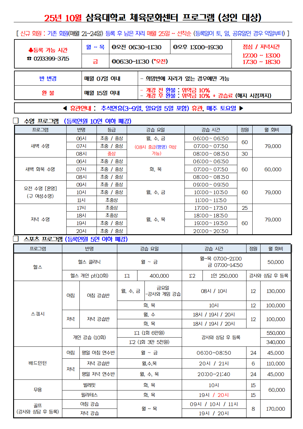 프로그램안내 PRINT 체육문화센터 정규 프로그램 (2025년 10월) 2025.09.22 조회수 763 sportscenter share facebook twitter kakaotalk 카카오톡 앱이설치된 모바일 기기에서만공유 가능합니다. https://www.syu.ac.kr/sportscenter/%ec%b2%b4%ec%9c%a1%eb%ac%b8%ed%99%94%ec%84%bc%ed%84%b0-%ec%a0%95%ea%b7%9c-%ed%94%84%eb%a1%9c%ea%b7%b8%eb%9e%a8-2025%eb%85%84-9%ec%9b%94-2/ 복사 facebook twitter kakaotalk 카카오톡 앱이설치된 모바일 기기에서만공유 가능합니다. 이전글 체육문화센터 정규 프로그램 (2025년 11월) 다음글 체육문화센터 정규 프로그램 (2025년 9월) 목록 건강한 신체에 건강한 정신이 깃듭니다. 삼육대학교 체육문화센터