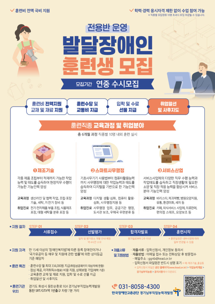 공지사항 PRINT 발달장애인 훈련생 모집 안내(수시모집) 2025.09.22 조회수 60 장애학생지원센터 share facebook twitter kakaotalk 카카오톡 앱이설치된 모바일 기기에서만공유 가능합니다. https://www.syu.ac.kr/sscd/2025/09/22/%eb%b0%9c%eb%8b%ac%ec%9e%a5%ec%95%a0%ec%9d%b8-%ed%9b%88%eb%a0%a8%ec%83%9d-%eb%aa%a8%ec%a7%91-%ec%95%88%eb%82%b4%ec%88%98%ec%8b%9c%eb%aa%a8%ec%a7%91/ 복사 Post Views: 60 발달장애-전용반-훈련생-모집상시-scaled.jpg (598.4 KB) facebook twitter kakaotalk 카카오톡 앱이설치된 모바일 기기에서만공유 가능합니다. 이전글 소방설비[전기] 산업기사과정 훈련생 모집안내(~10월30일까지) 다음글 취업역량 강화반 모집 안내 목록 장애학생들의 빛나는 학창 생활과 함께 합니다 장애학생지원센터
