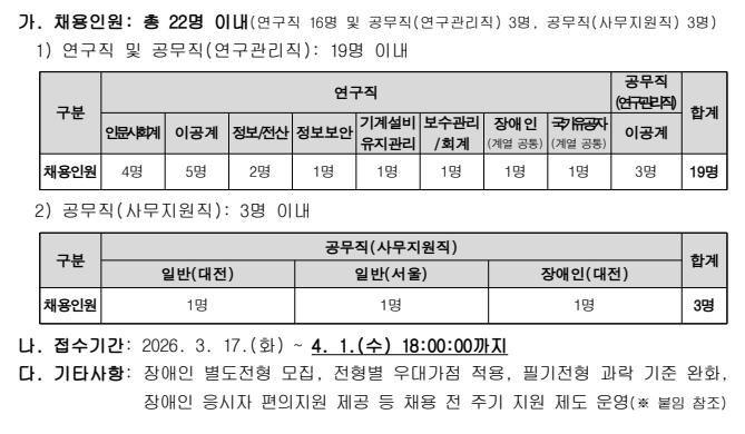 공지사항 PRINT 2026년도 한국연구재단 제1차 정규직 채용공고 홍보 2026.03.25 조회수 56 장애학생지원센터 share facebook twitter kakaotalk 카카오톡 앱이설치된 모바일 기기에서만공유 가능합니다. https://www.syu.ac.kr/sscd/2026/03/25/2026%eb%85%84%eb%8f%84-%ed%95%9c%ea%b5%ad%ec%97%b0%ea%b5%ac%ec%9e%ac%eb%8b%a8-%ec%a0%9c1%ec%b0%a8-%ec%a0%95%ea%b7%9c%ec%a7%81-%ec%b1%84%ec%9a%a9%ea%b3%b5%ea%b3%a0-%ed%99%8d%eb%b3%b4/ 복사 한국연구재단 홈페이지 채용공고(https://www.nrf.re.kr) 및 입사지원 홈페이지(https://nrf.ai-recruit.kr/)에서 확인할 수 있으니 참고하여 주시기 바랍니다. Post Views: 56 붙임1-2026년도-제1차-한국연구재단-채용-공고문연구직-및-공무직연구관리직.zip (1.6 MB) 붙임2-2026년도-제1차-한국연구재단-채용-공고문공무직사무지원직.zip (1.4 MB) facebook twitter kakaotalk 카카오톡 앱이설치된 모바일 기기에서만공유 가능합니다. 이전글 2026-1학기 장애학생 서포터즈 모집 안내 (추가) 다음글 2026 AI를 활용한 장애인식개선 동화 공모전 목록 장애학생들의 빛나는 학창 생활과 함께 합니다 장애학생지원센터